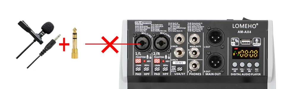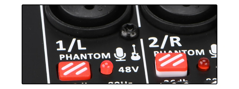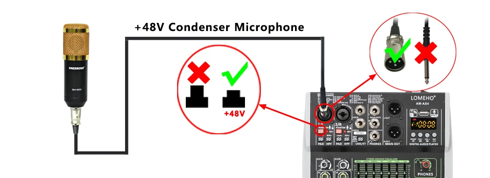 2) Пожалуйста, не включайте фантомное питание + 48 В, иначе питание может сжечь динамический микрофон.