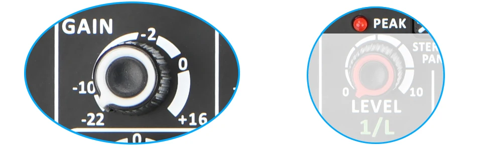2. Чтобы получить наилучший баланс между соотношением сигнал/шум и динамическим диапазоном, отрегулируйте усиление так, чтобы индикатор PEAK лишь изредка и кратковременно указывал самые высокие входные переходные процессы.