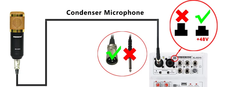 1. Убедитесь, что ваш конденсаторный микрофон поддерживает фантомное питание + 48 В.