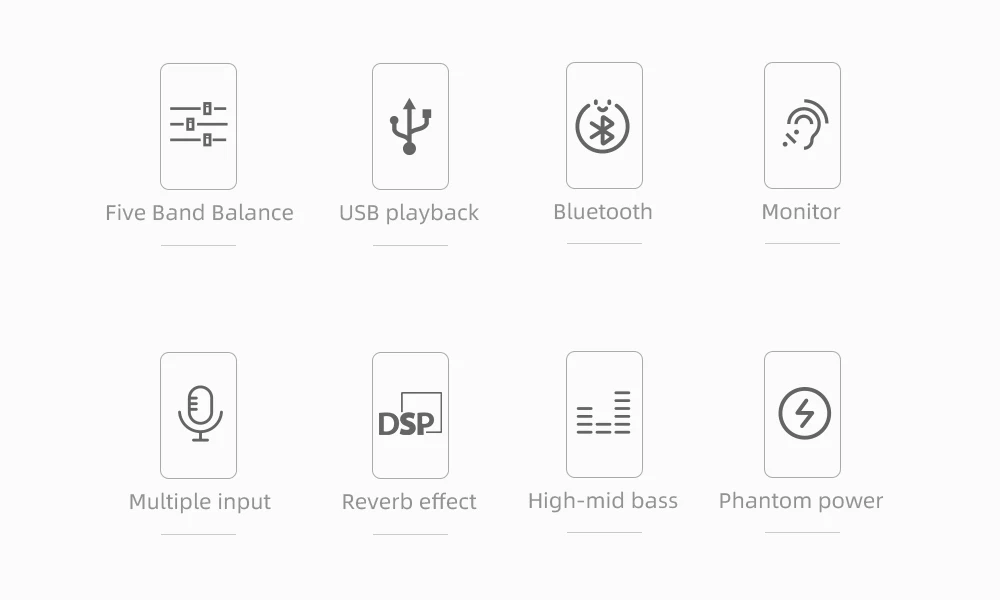 Количество каналов: 8 Микрофонный интерфейс: 8 Вспомогательный канал: 1AUX Потребляемая мощность: 30 Вт EFFECT эффект: 99DSP