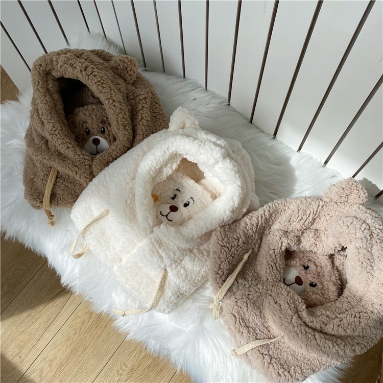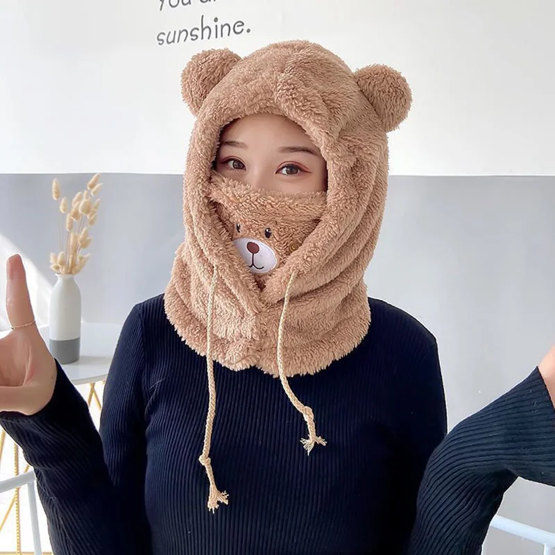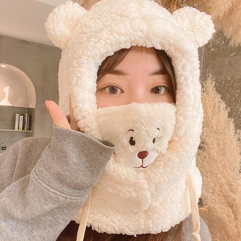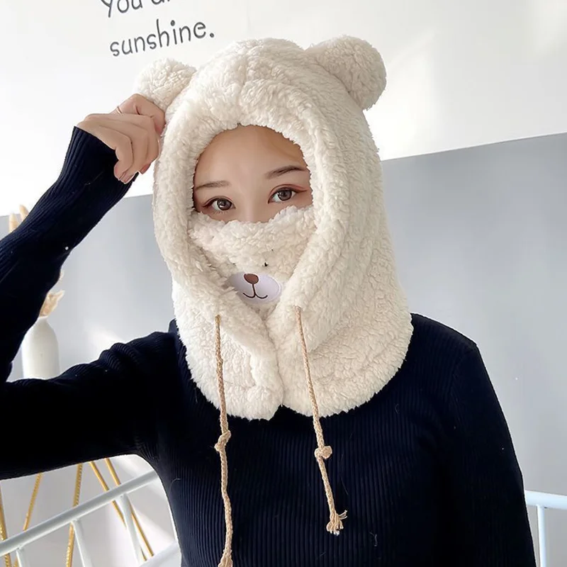 Милая шапка с ушками медведя из мультфильма, шапка из овечьей шерсти, теплая утолщенная защита ушей с теплой маской, Шапка-бини, Осенняя шапка Skullies для женщин и девочек