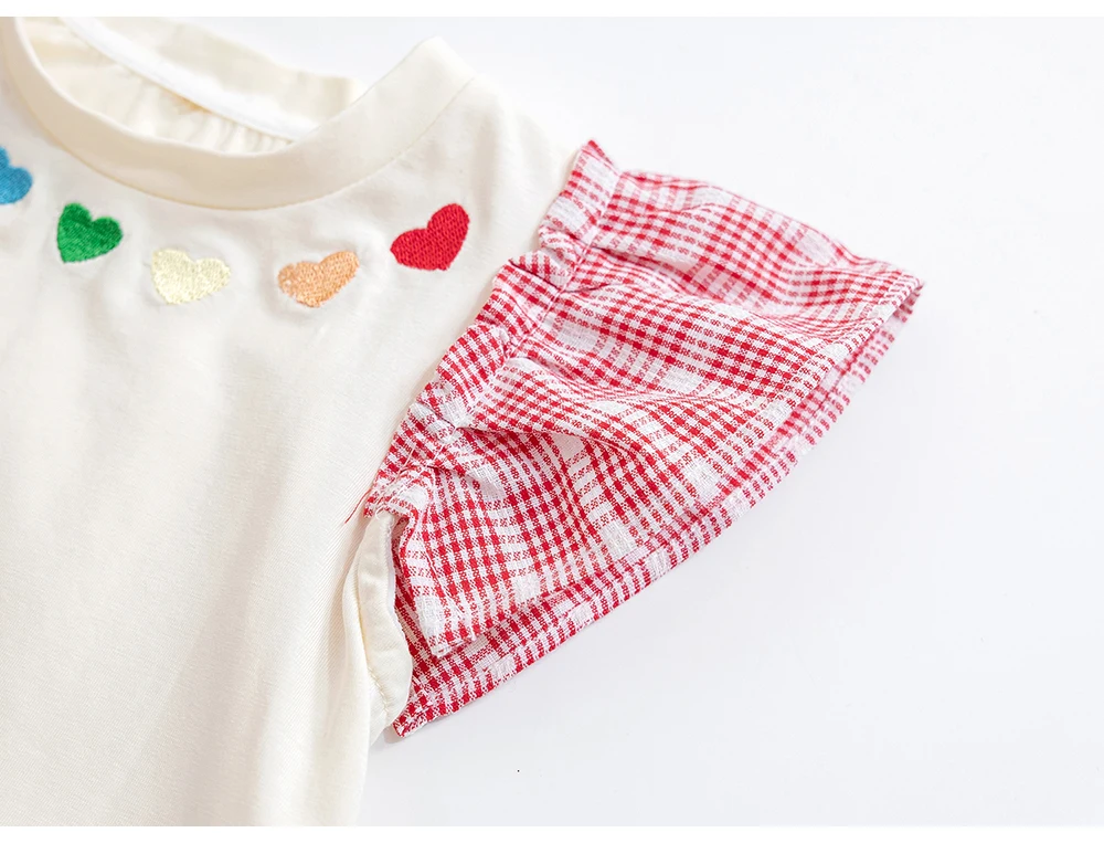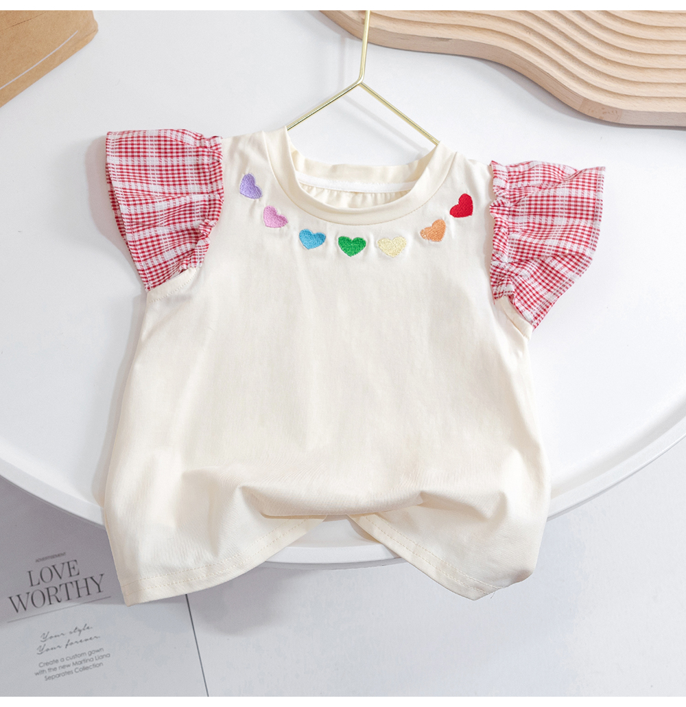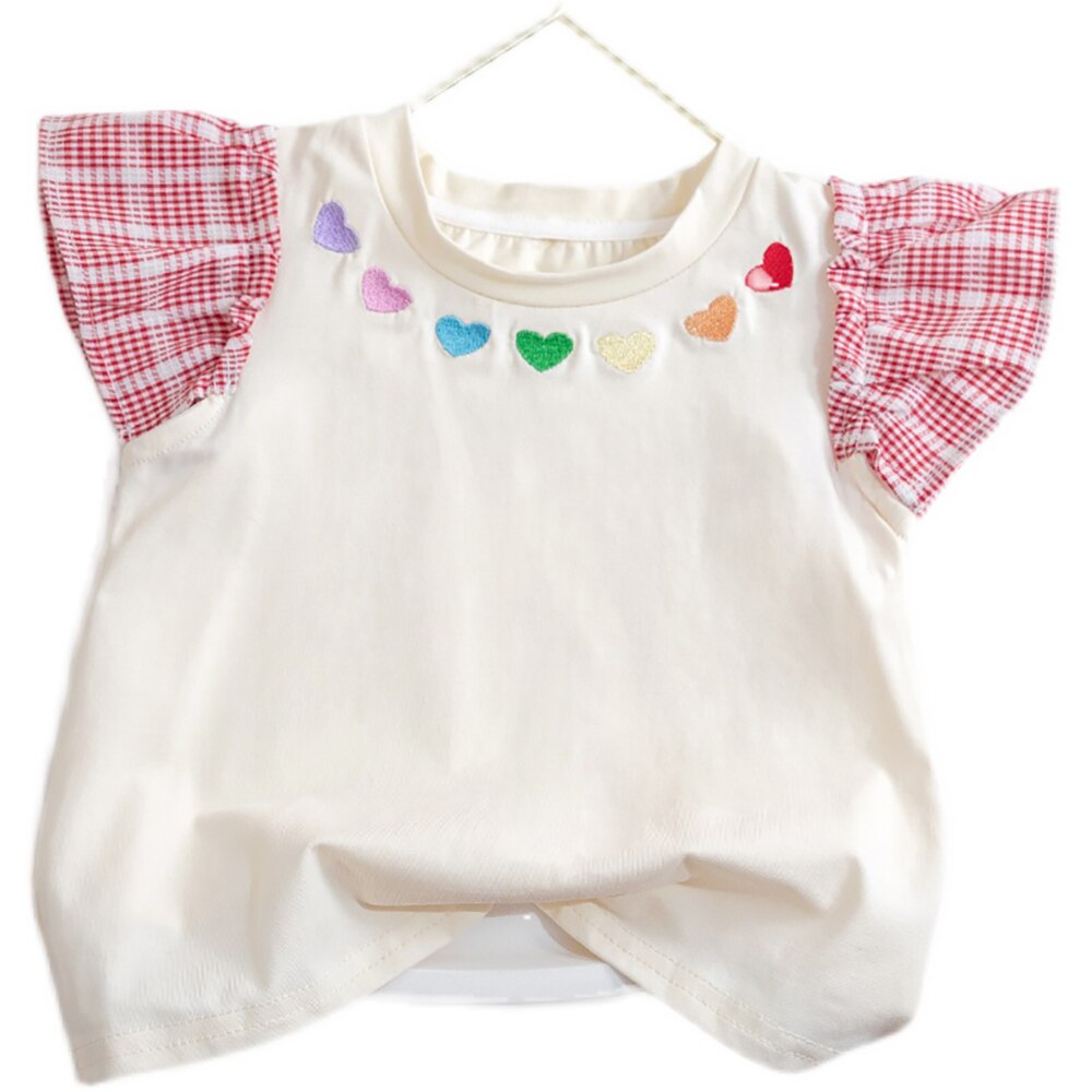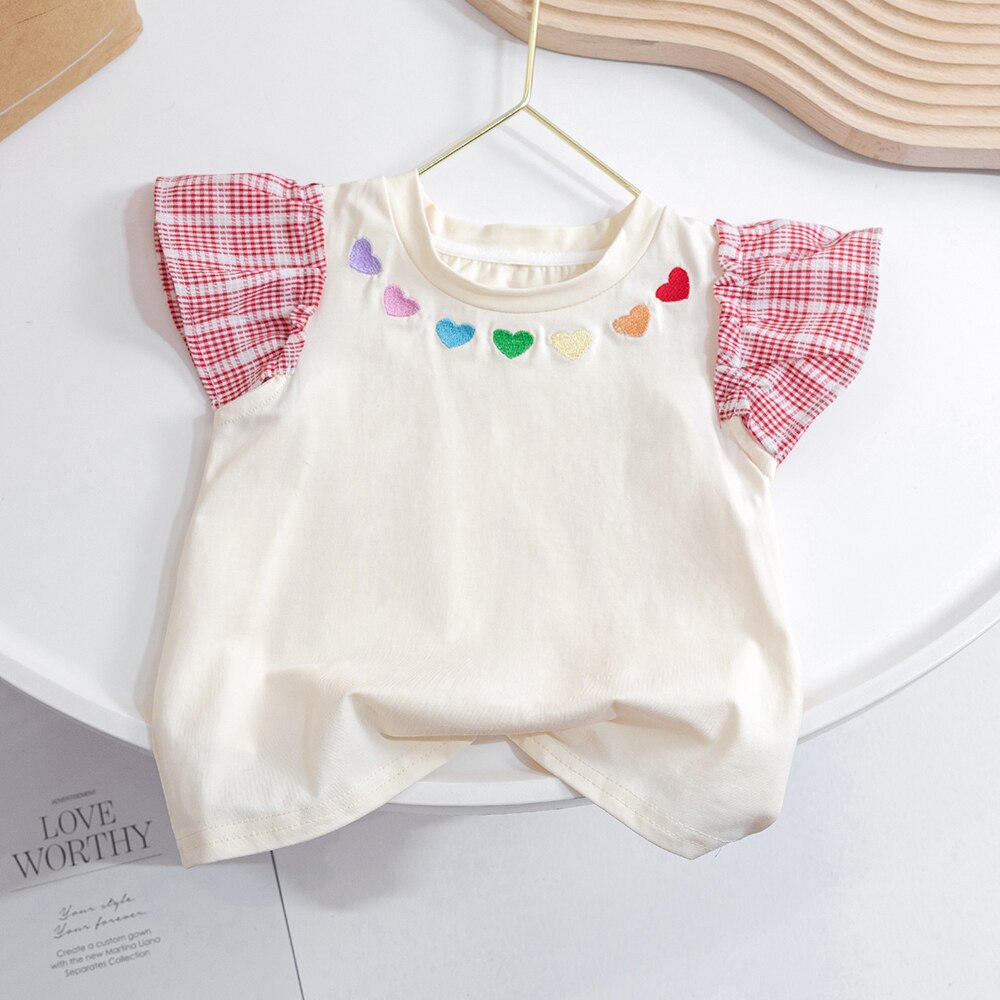 Милые футболки для маленьких девочек с рукавами-мушками, летний пуловер в Корейском стиле с вышивкой в виде сердечек, Детская футболка с коротким рукавом для девочек, топы