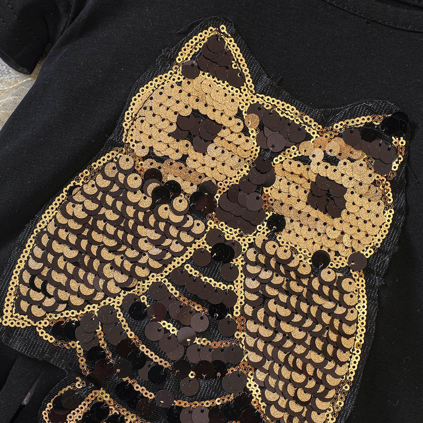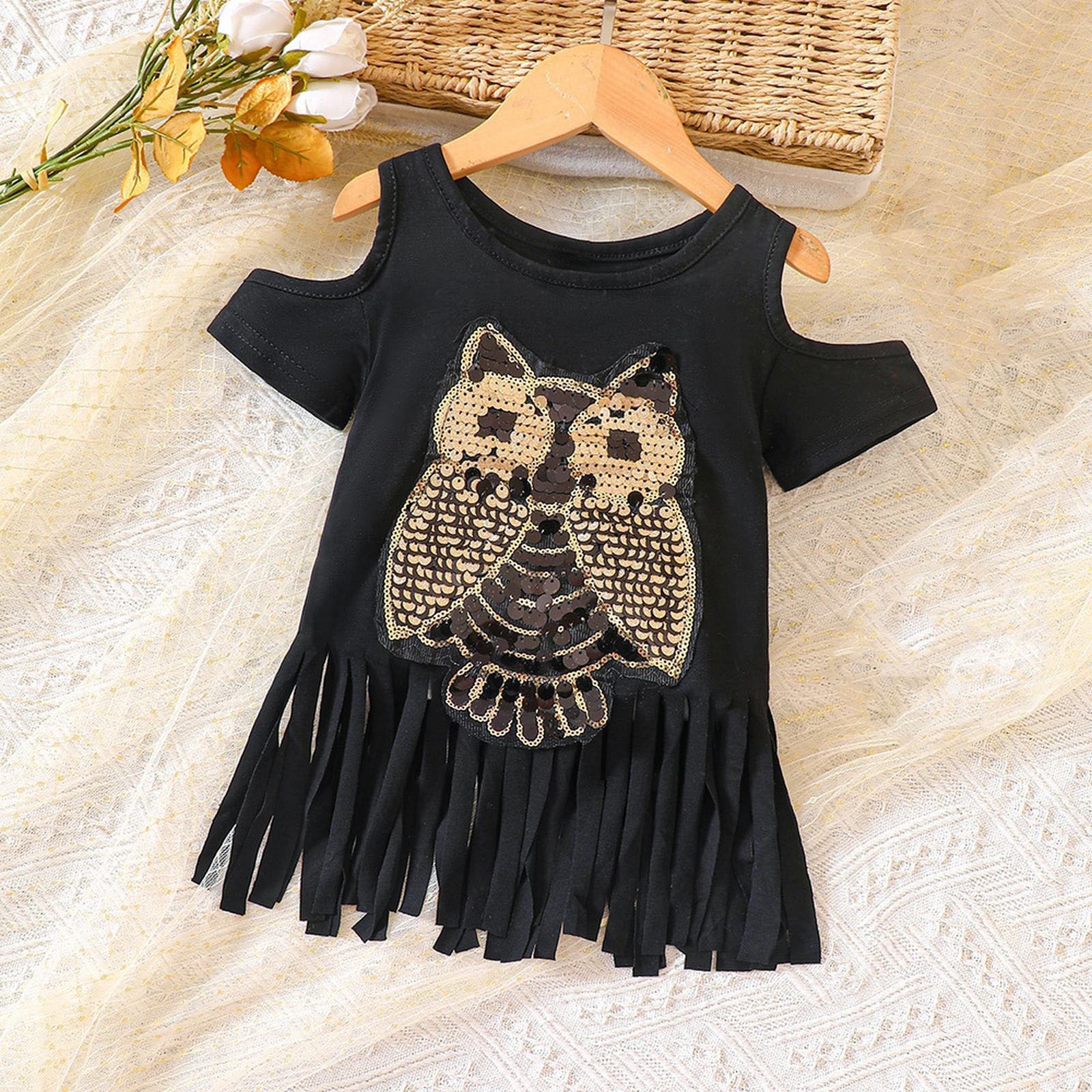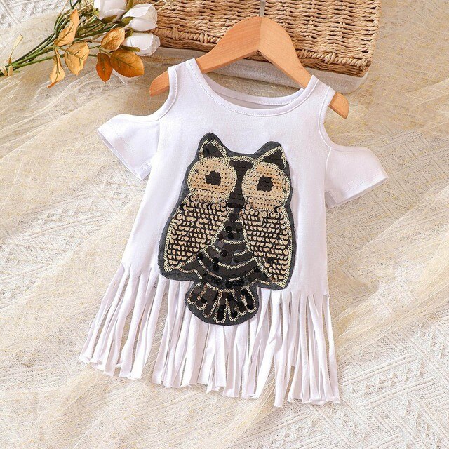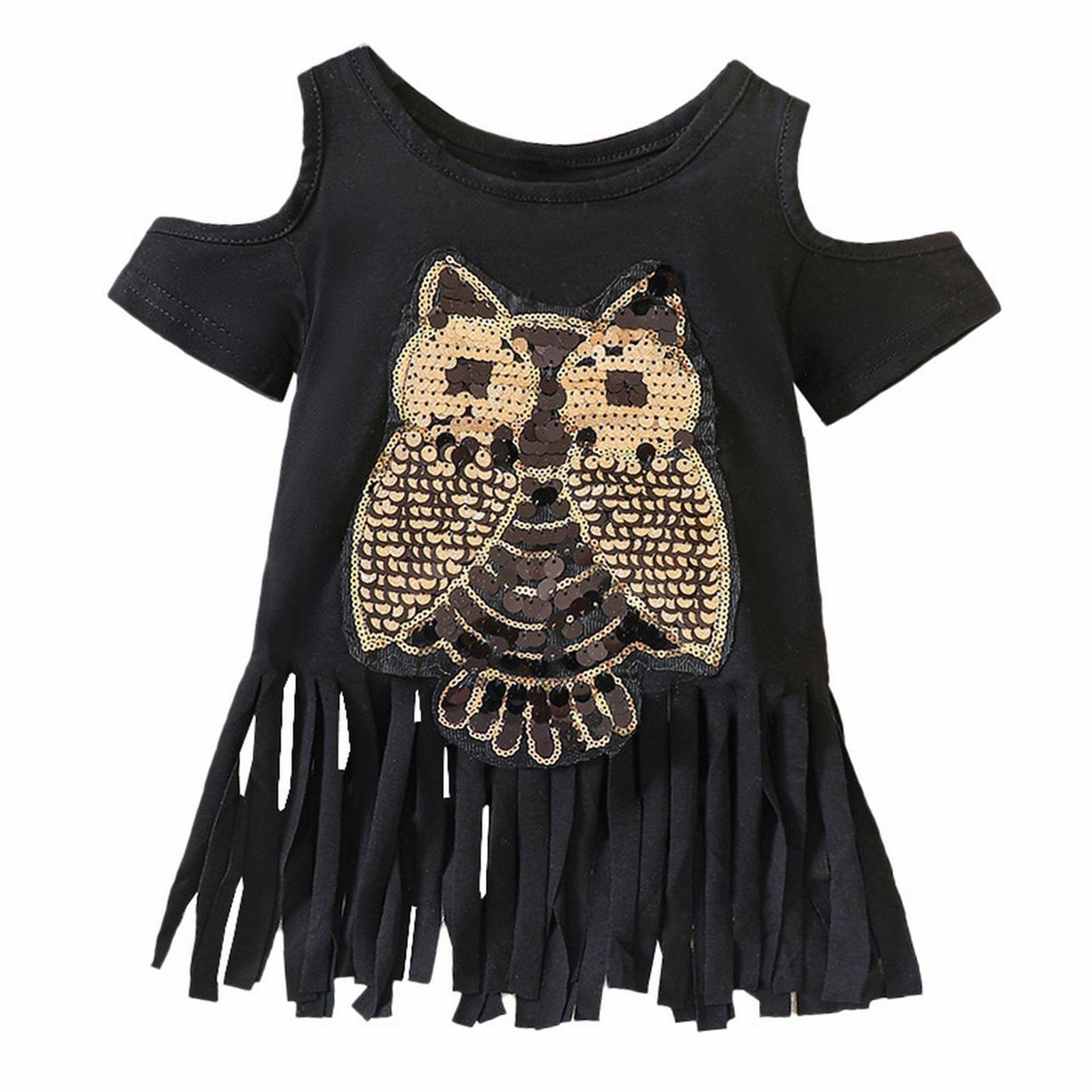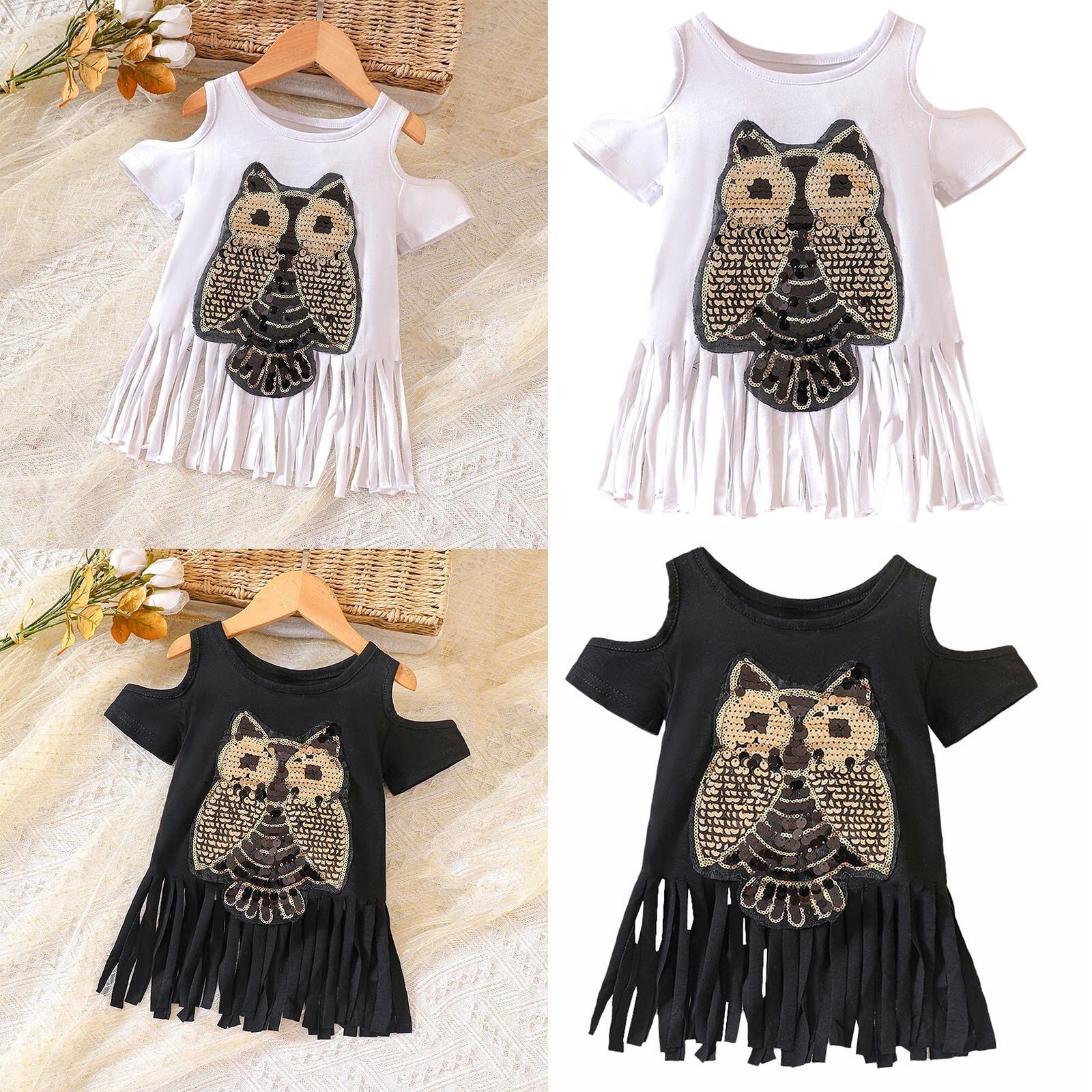 Милые топы с принтом и коротким рукавом, детская одежда, летняя футболка для девочек, длинная футболка с бахромой и совой