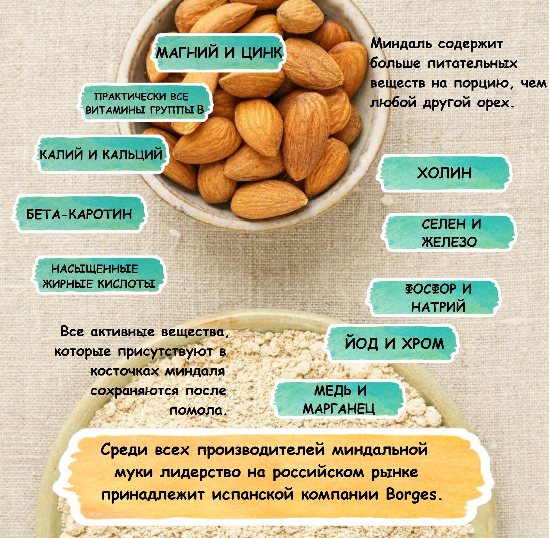 Описание: Миндальная мука Borges - идеальный ингредиент для ваших кулинарных шедевров, который произведен в Испании из отборного миндаля в соответствии с высочайшими стандартами качества Borges.