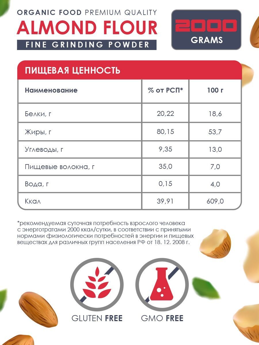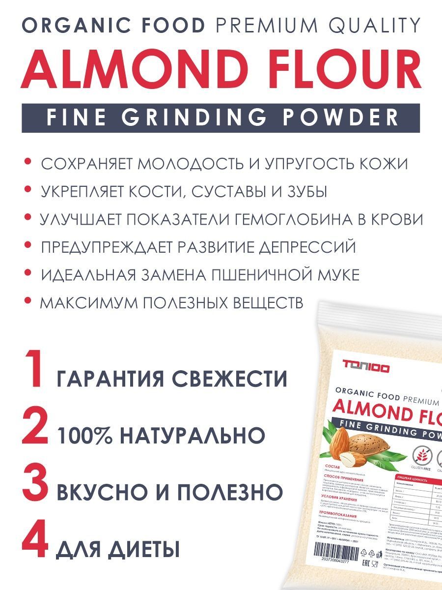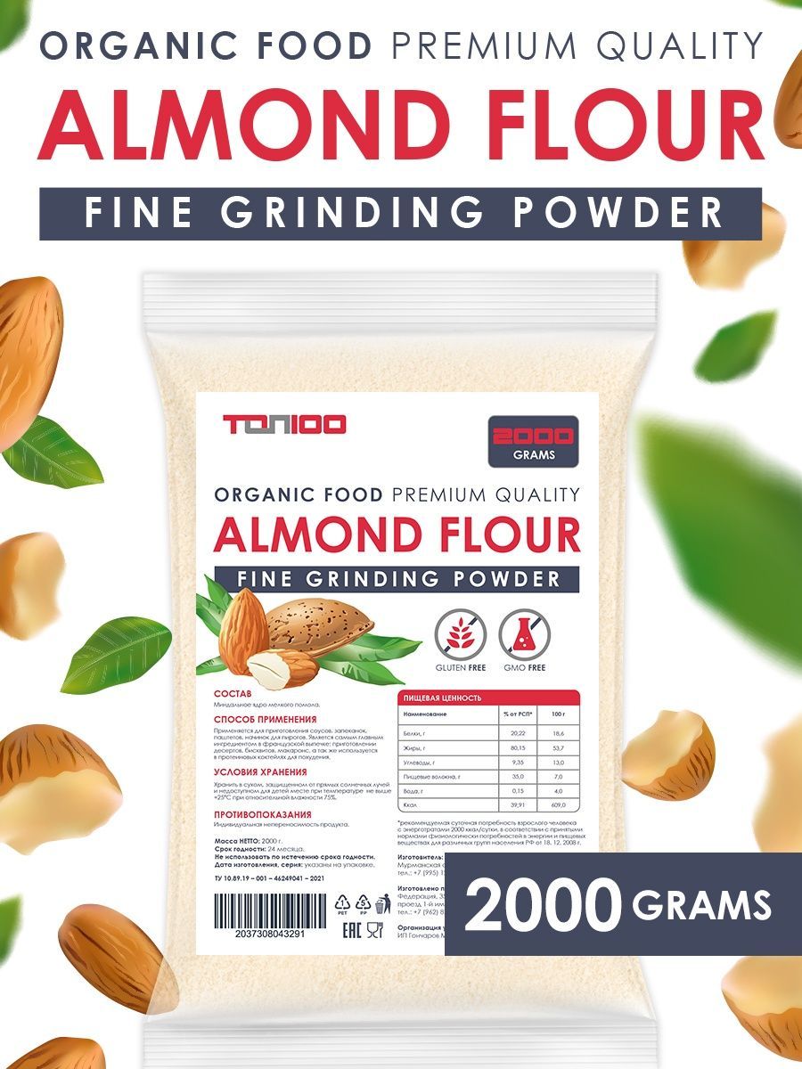 Описание: Миндальная мука Top 100 есть не что иное, как перемолотый в мелкий порошок миндальный орех, один из самых вкусных представителей орехового братства. Лечебные свойства миндальной муки обусловлены её химическим составом, в котором содержатся: насыщенные жирные кислоты, холин, бета-каротин, витамины В1, В2, В5, В6, В9, А, С, Е и РР, а также калий, кальций, магний, цинк, селен, медь и марганец, железо, хлор и сера, йод, хром, фосфор и натрий. Миндальная мука не только вкусна, но и чрезвычайно полезна, её рекомендуется употреблять при нарушении зрения, бессоннице, малокровии и судорогах. Мука миндальная мелкого помола без глютена идеальна для выпечки, десертов (макаронс, марципана, бисквитов, печенья) и для загущения соусов и крем-супов. Мука из миндаля это и правильное питание, спортивное питание для похудения и незаменимый компонент, чтобы приготовить кондитерский крем, протеиновый коктейль, коктейль для похудения и спорт питание. Веганский продукт, отлично подходит для кето диеты, без консервантов, без добавок, без ГМО.