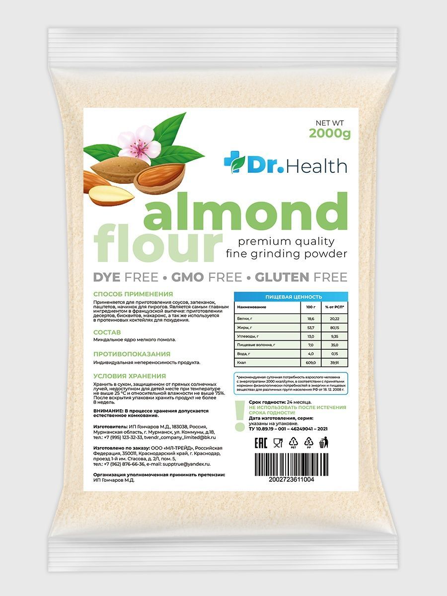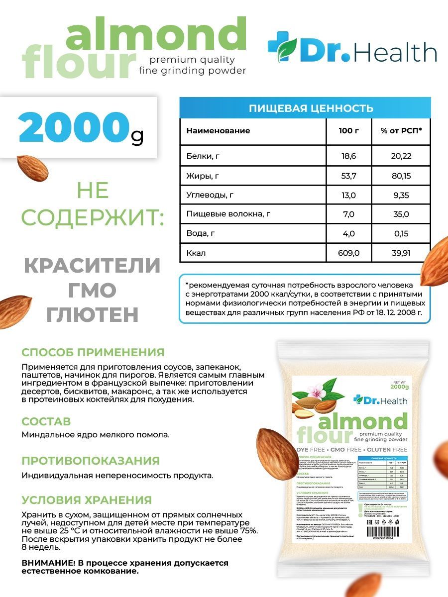 Описание: Миндальная мука Dr. Health есть не что иное, как перемолотый в мелкий порошок миндальный орех, один из самых вкусных представителей орехового братства. Лечебные свойства миндальной муки обусловлены её химическим составом, в котором содержатся: насыщенные жирные кислоты, холин, бета-каротин, витамины В1, В2, В5, В6, В9, А, С, Е и РР, а также калий, кальций, магний, цинк, селен, медь и марганец, железо, хлор и сера, йод, хром, фосфор и натрий. Миндальная мука не только вкусна, но и чрезвычайно полезна, её рекомендуется употреблять при нарушении зрения, бессоннице, малокровии и судорогах. Мука миндальная мелкого помола без глютена идеальна для выпечки, десертов (макаронс, марципана, бисквитов, печенья) и для загущения соусов и крем-супов. Мука из миндаля это и правильное питание, спортивное питание для похудения и незаменимый компонент, чтобы приготовить кондитерский крем, протеиновый коктейль, коктейль для похудения и спорт питание. Веганский продукт, отлично подходит для кето диеты, без консервантов, без добавок, без ГМО.