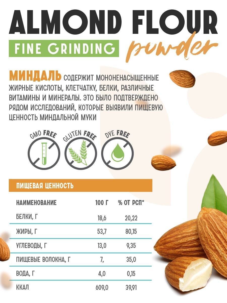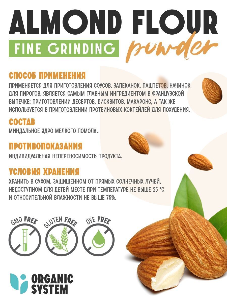 Описание: Миндальная мука Organic System есть не что иное, как перемолотый в мелкий порошок миндальный орех, один из самых вкусных представителей орехового братства. Лечебные свойства миндальной муки обусловлены её химическим составом, в котором содержатся: насыщенные жирные кислоты, холин, бета-каротин, витамины В1, В2, В5, В6, В9, А, С, Е и РР, а также калий, кальций, магний, цинк, селен, медь и марганец, железо, хлор и сера, йод, хром, фосфор и натрий. Миндальная мука не только вкусна, но и чрезвычайно полезна, её рекомендуется употреблять при нарушении зрения, бессоннице, малокровии и судорогах. Мука миндальная мелкого помола без глютена идеальна для выпечки, десертов (макаронс, марципана, бисквитов, печенья) и для загущения соусов и крем-супов. Мука из миндаля это и правильное питание, спортивное питание для похудения и незаменимый компонент, чтобы приготовить кондитерский крем, протеиновый коктейль, коктейль для похудения и спорт питание. Веганский продукт, отлично подходит для кето диеты, без консервантов, без добавок, без ГМО.
