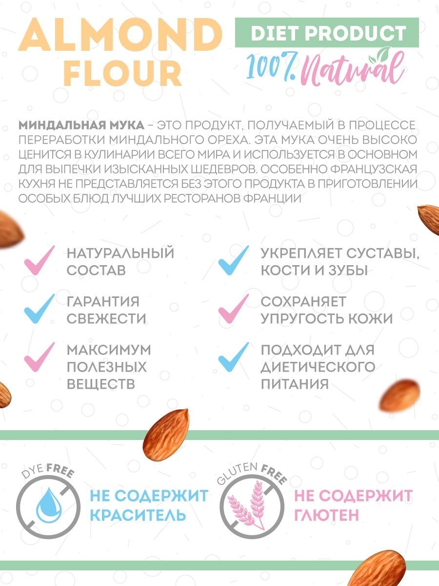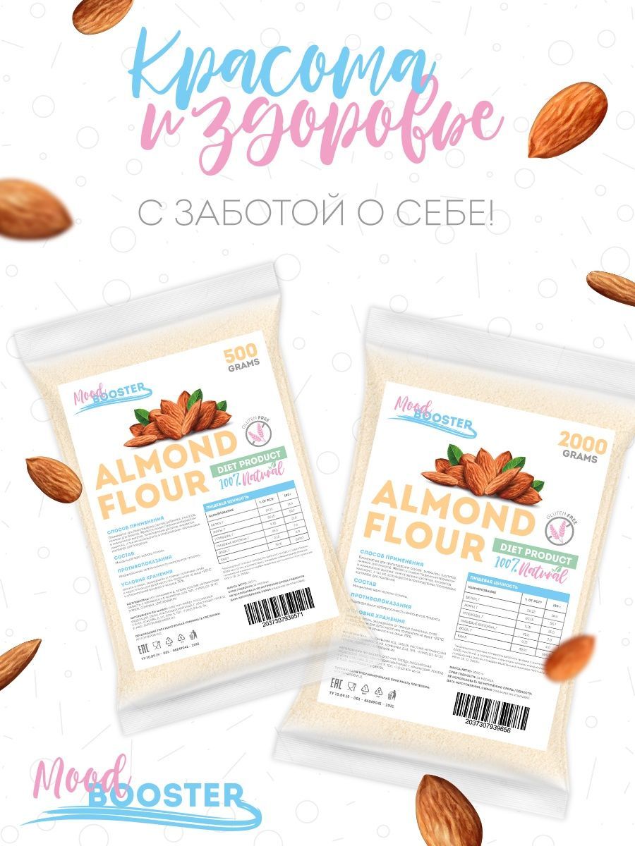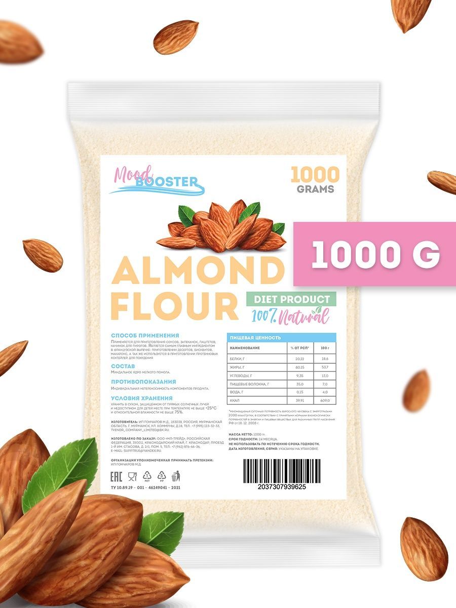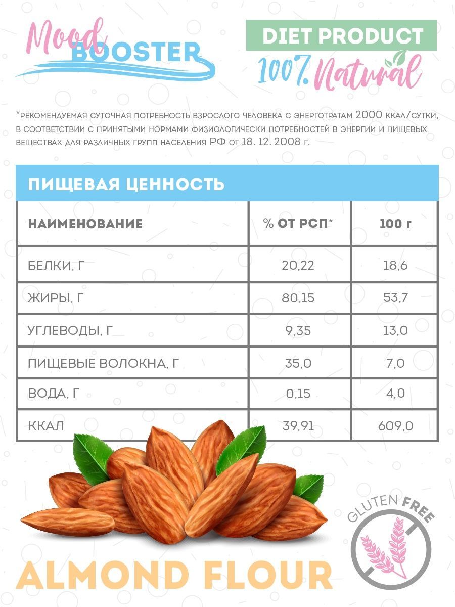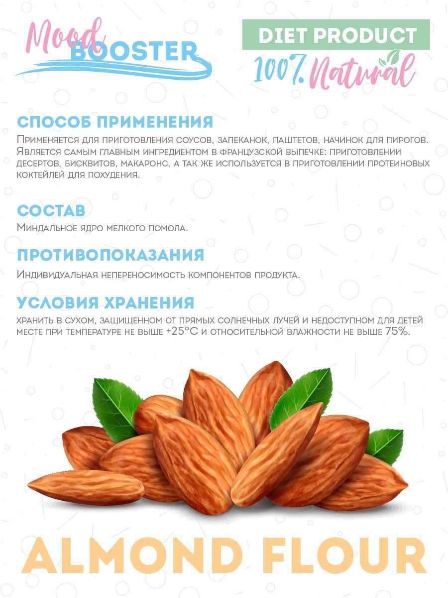 Описание: Миндальная мука Mood Booster есть не что иное, как перемолотый в мелкий порошок миндальный орех, один из самых вкусных представителей орехового братства. Лечебные свойства миндальной муки обусловлены её химическим составом, в котором содержатся: насыщенные жирные кислоты, холин, бета-каротин, витамины В1, В2, В5, В6, В9, А, С, Е и РР, а также калий, кальций, магний, цинк, селен, медь и марганец, железо, хлор и сера, йод, хром, фосфор и натрий. Миндальная мука не только вкусна, но и чрезвычайно полезна, её рекомендуется употреблять при нарушении зрения, бессоннице, малокровии и судорогах. Мука миндальная мелкого помола без глютена идеальна для выпечки, десертов (макаронс, марципана, бисквитов, печенья) и для загущения соусов и крем-супов. Мука из миндаля это и правильное питание, спортивное питание для похудения и незаменимый компонент, чтобы приготовить кондитерский крем, протеиновый коктейль, коктейль для похудения и спорт питание. Веганский продукт, отлично подходит для кето диеты, без консервантов, без добавок, без ГМО.