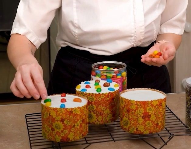 В молоко комнатной температуры высыпаем 1/2 части сахарного песка. Перемешиваем.Добавляем дрожжи. Перемешиваем. Вливаем в 1/2 части пшеничной муки. Перемешиваем.Накрываем полотенцем или пищевой пленкой и оставляем в теплом месте на 30 минут.Отделяем желтки от белков.Перемешиваем желтки с оставшейся частью счахарного песка.Добавляем желток с сахарок основной смеси и перемешиваем.Добавляем миндальную муку (Код товара: 281277177) и оставшуюся часть пшеничной мукик основной смеси.Добавляем оливковое масло.Добавляем растопленное сливочное масло.Перемешиваем до получения однородной массы.Курагу (Код товара: 804031260) , вяленую клюкву (Код товара: 804031260) и изюм (Код товара: 833024767) промываем и просушиваем.Курагу нарезаем на четвертинки.Все сухофрукты обваливаем в муке. И добавляем в тесто. Перемешиваем.Распределяем тесто с сухофруктами по формам.Накрываем полотенцем и даем настоятся 1 час.Отправляем в духовку при 170 градусов до готовности.В сотейнике доводим до кипения сахар с водой. Далее снимаем с огня.Добавляем набухший желатин в сотейник.Добавляем лимонную кислоту. Перемешиваем.Взбиваем глазурь в плотную пышную массу.Распределяем глазурь.Украшаем верх кулича миксом «Радуга» (Код товара: 641894431)Снимаем бумагу и даем глазури аккуратно стечь по краям. Приятного аппетита! Подробный видео рецепт на нашем канале "ГОТОВИМ С ПОЗИТИВОМ!" youtube.com/@cook.positive