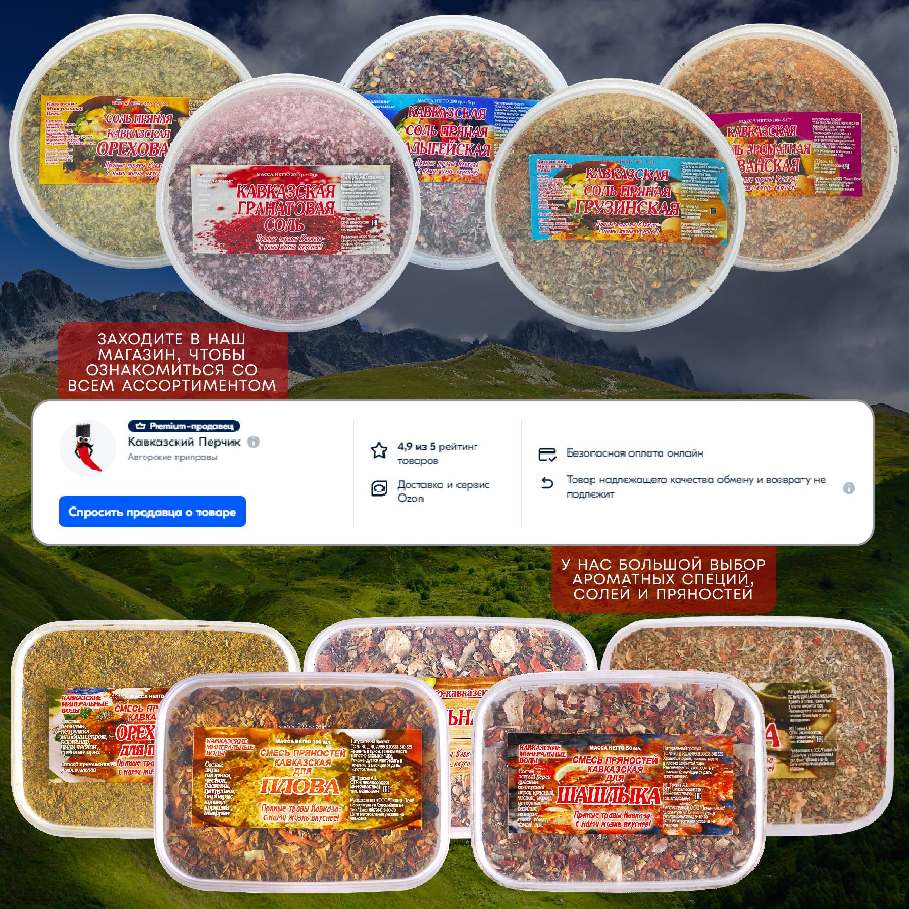 «Кавказский Перчик»«Кавказский Перчик» - это только натуральный состав, душистые травы и пряности Кавказа заготовленные вручную. Наши приправы изготовлены из 100% натуральных ингредиентов, не содержат химии и глутаматов. Мы сами составляем гармонию вкусов во всех наших приправах. Можно сказать, что это авторские специи. Поэтому за качество, вкус и аромат отвечаем!
