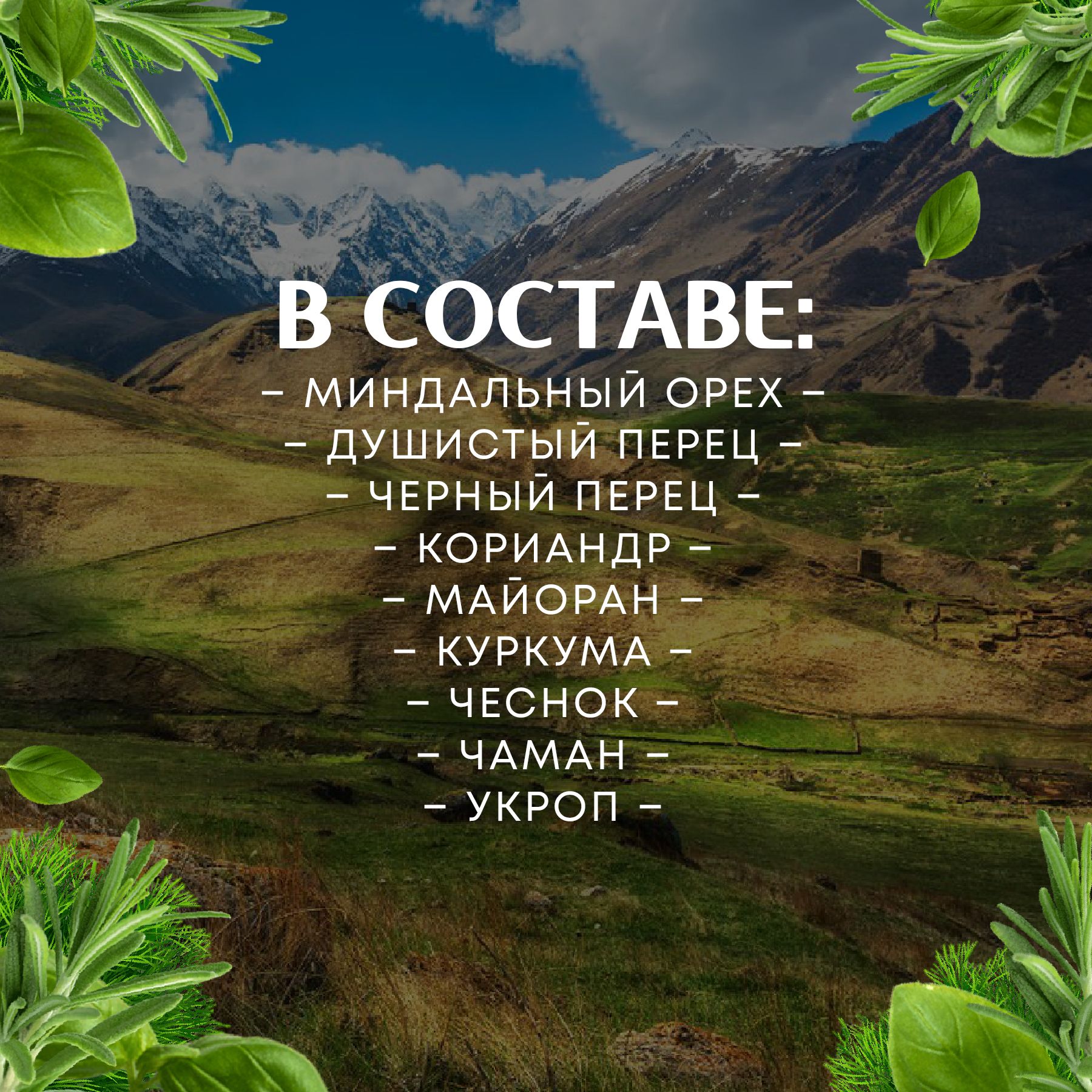 Соль, куркума, майоран, петрушка свежая, укроп свежий, миндаль, чаман, кайенский чили, перец черный, кориандр, чеснок