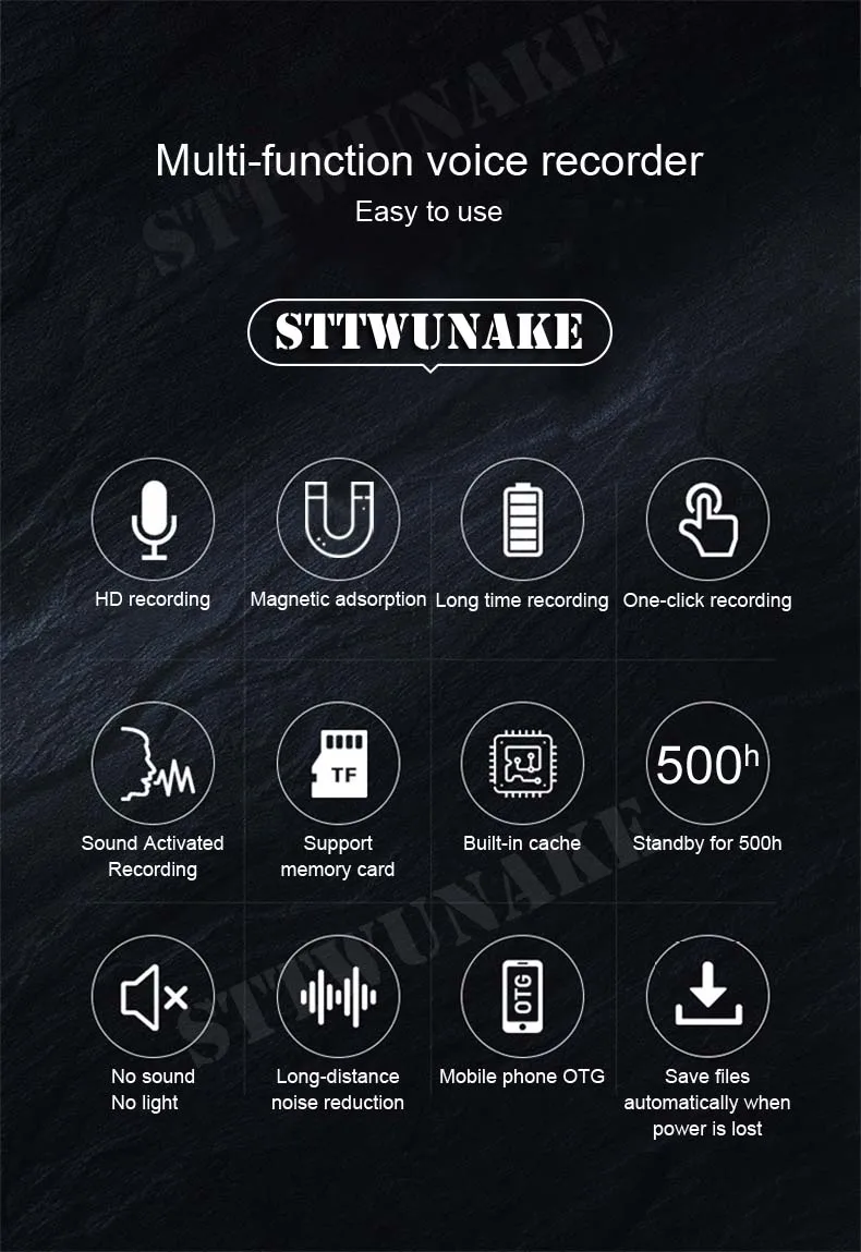 Включите функцию записи с активацией звука, звук превышает 30 децибел, чтобы начать запись, звук меньше 30 децибел, рекордер прекращает запись, помогая вам сэкономить электроэнергию и память.