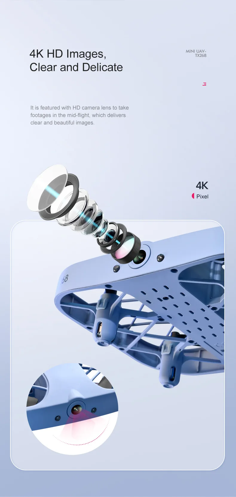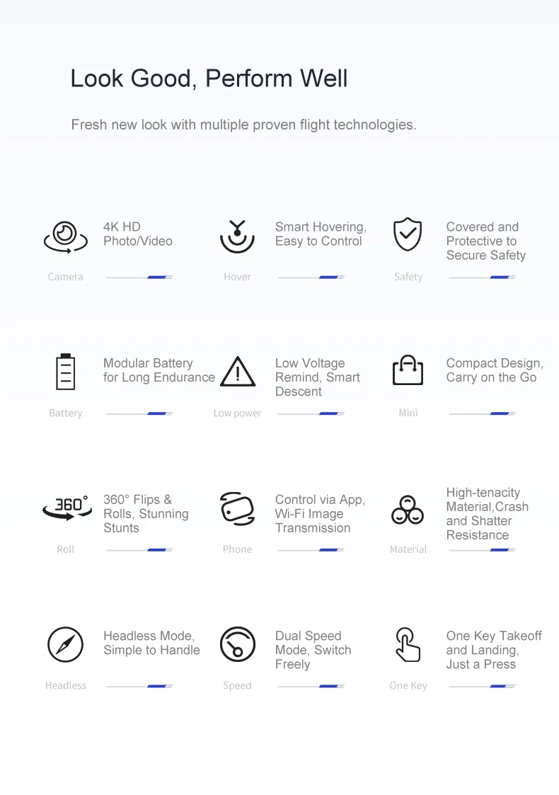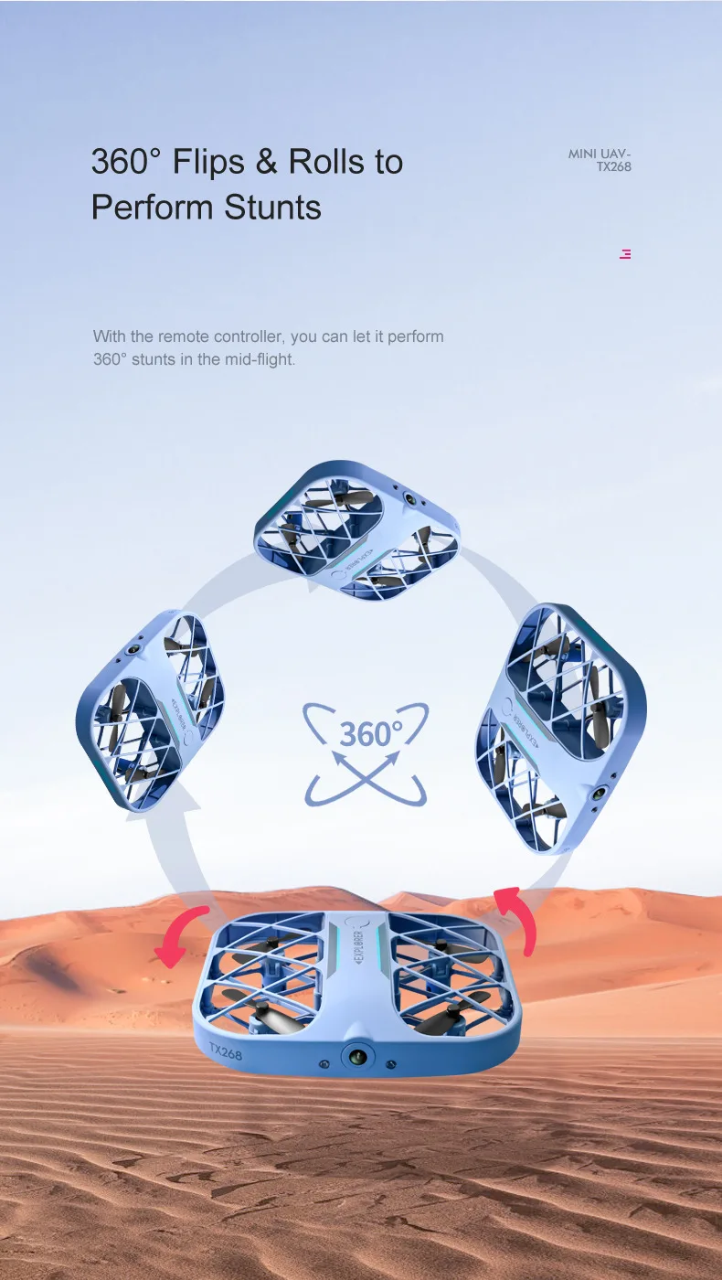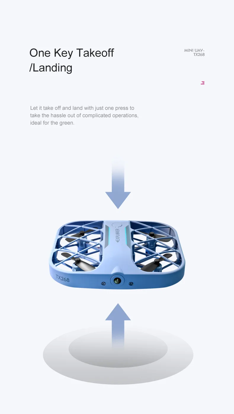 Удержание высоты:Позволяет дронам автоматически зависать. Дрон может оставаться на определенной высоте, когда ваши руки вне контроллера. Пожалуйста, попробуйте его в помещении без ветра.