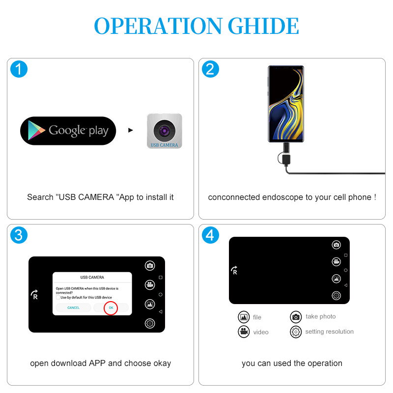 1. На телефонах Android: отсканируйте QR-код в руководстве, чтобы установить приложение, или с компакт-диска, установите приложение, или перейдите по ссылке для загрузки, чтобы установить приложение, затем на мобильном рабочем столе появится значок, нажмите на значок, продукт доступен для использования. Этим эндоскопом для Android очень легко управлять, просто загрузите приложение и вставьте эндоскоп в свое устройство, приложение автоматически распознает его (убедитесь, что на вашем телефоне есть OTG, функция UVC и поддержка внешней камеры).