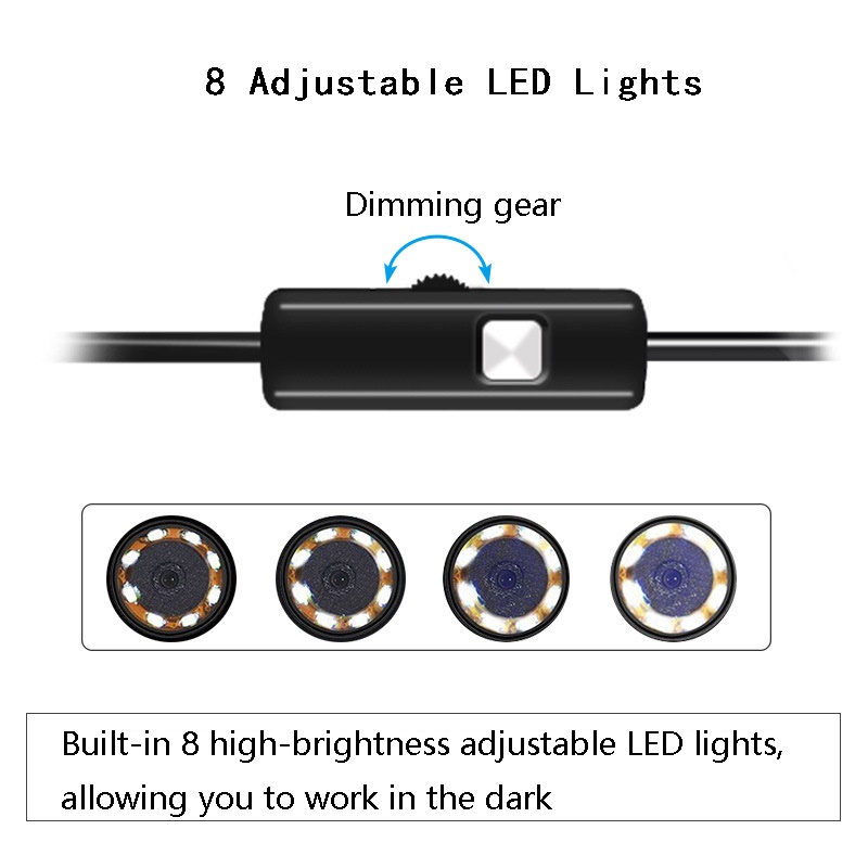 2. Эта эндоскопова камеры имеет Поворотное Колесо, используемое для регулировки яркости шести светодиодных фонарей, чтобы они работали в некоторых местах с недостаточным освещением.
