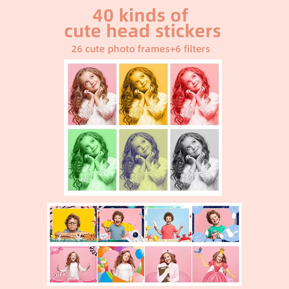 【Веселые и креативные особенности】 Наша цифровая камера оснащена 40 видами симпатичных наклеек на голову, 26 очаровательными рамками для фотографий и 6 фильтрами, которые позволяют добавить индивидуальности вашим фотографиям, сделав каждую из них уникальной.