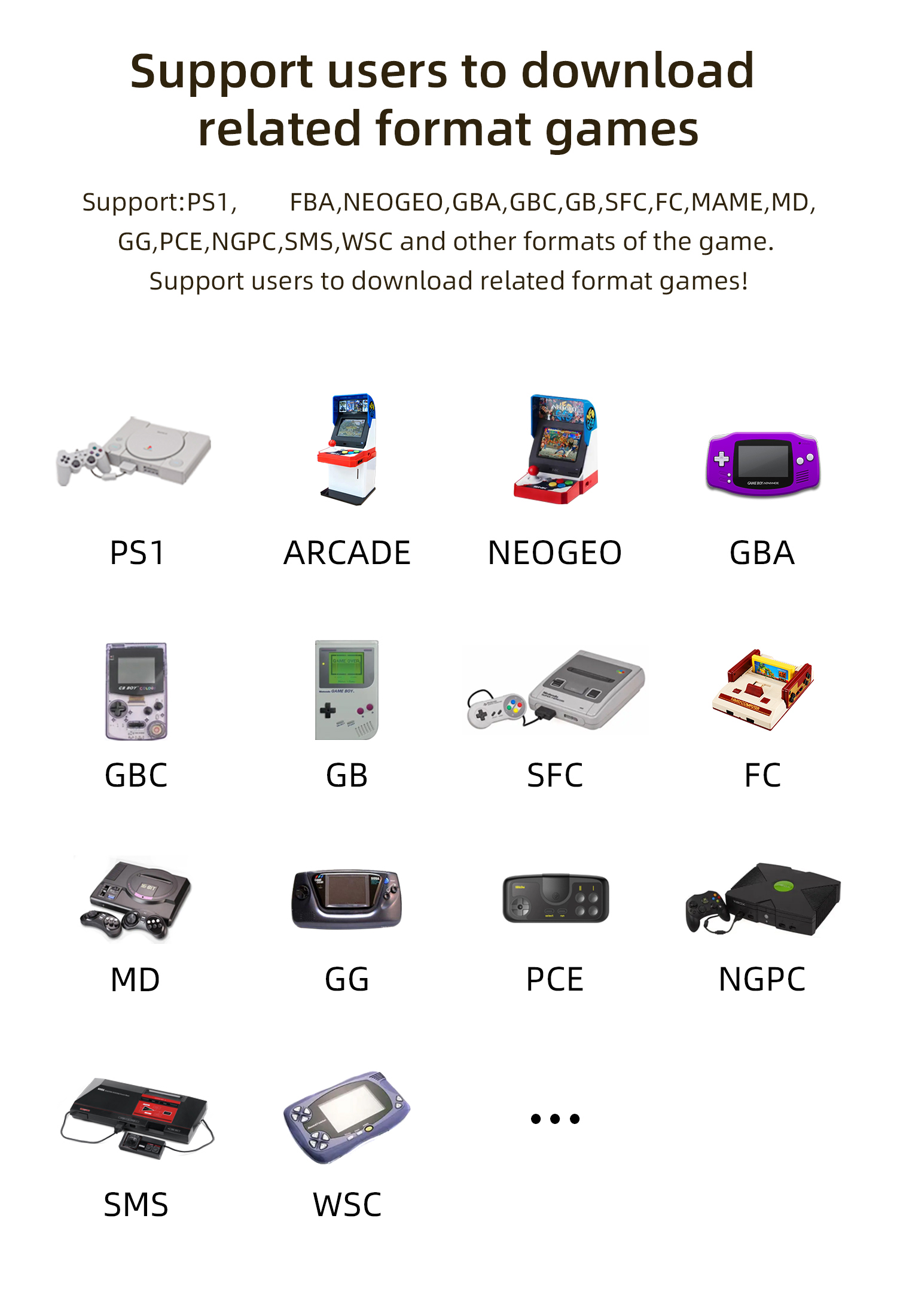 Поддержка: PS1,FBA,NEOGEO,GBA,GBC,GB,SFC,FC,MAME,MD,GG,