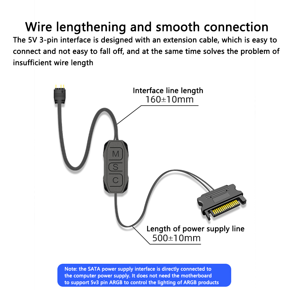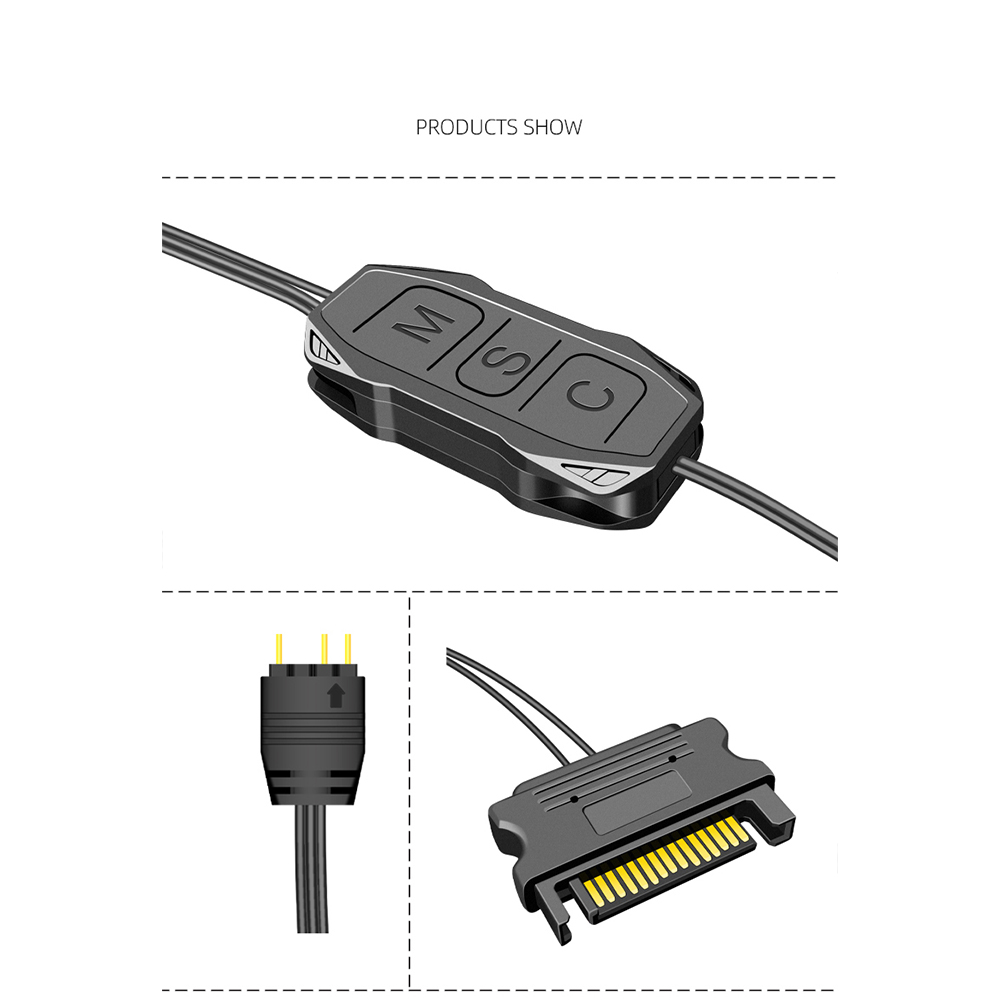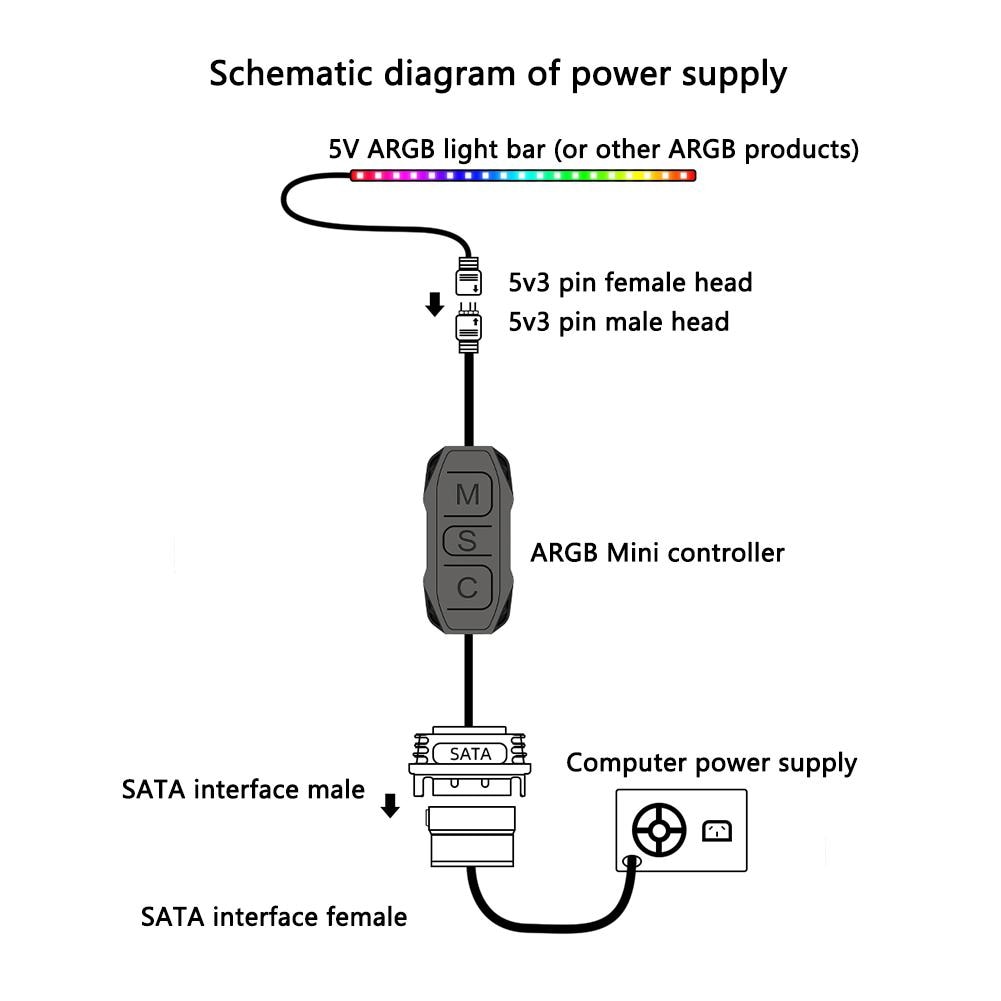 1. Этот контроллер представляет собой 5V 3-контактный ARGB продукт SATA источника питания контроллера, он не нуждается в материнская плата, просто подключите источника питания SATA интерфейс к источнику питания.