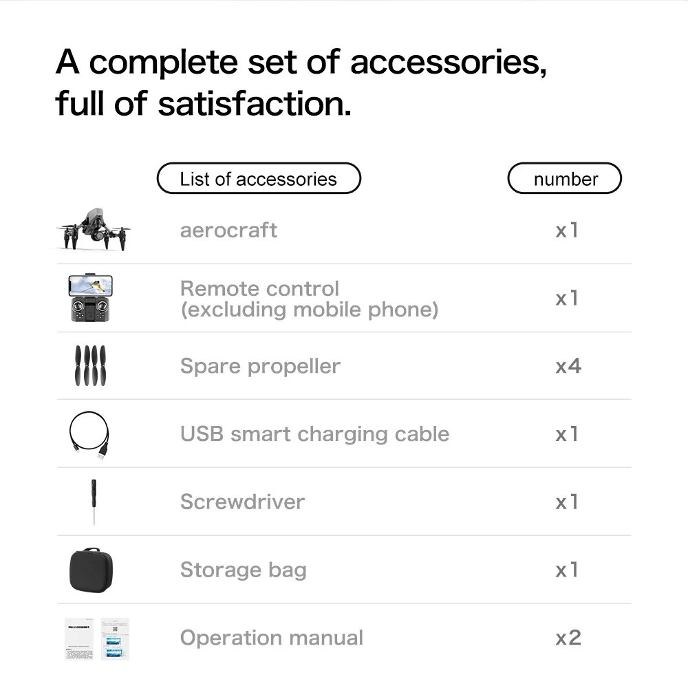 Вверх/вниз, вперед/назад, влево/вправо, боковой полет, 3 уровня скорости полета, светодиодные фонари, следование, объемный полет, полет по путевой точке, режим удержания высоты, Упрощенный режим управления, возврат одной кнопкой, Взлет/посадка одной кнопкой, WiFi FPV, камера/видео.