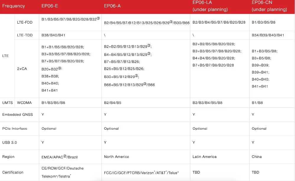 Разработанный в форм-факторе Mini PCIe, EP06 содержит 4 варианта (EP06-E, EP06-A, EP06-LA и ①①) для различных целевых регионов, и эти варианты охватывают почти все основные несущие потока по всему миру.