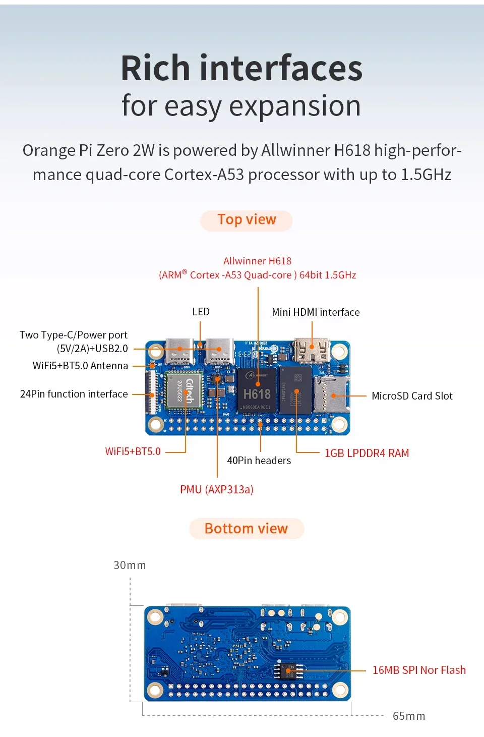 <span class="SnowProductCharacteristics_SnowProductCharacteristicsItem__titleContent__534v9">Orange Pi Zero 2W PCB Size</span> 30*65*1.2mm