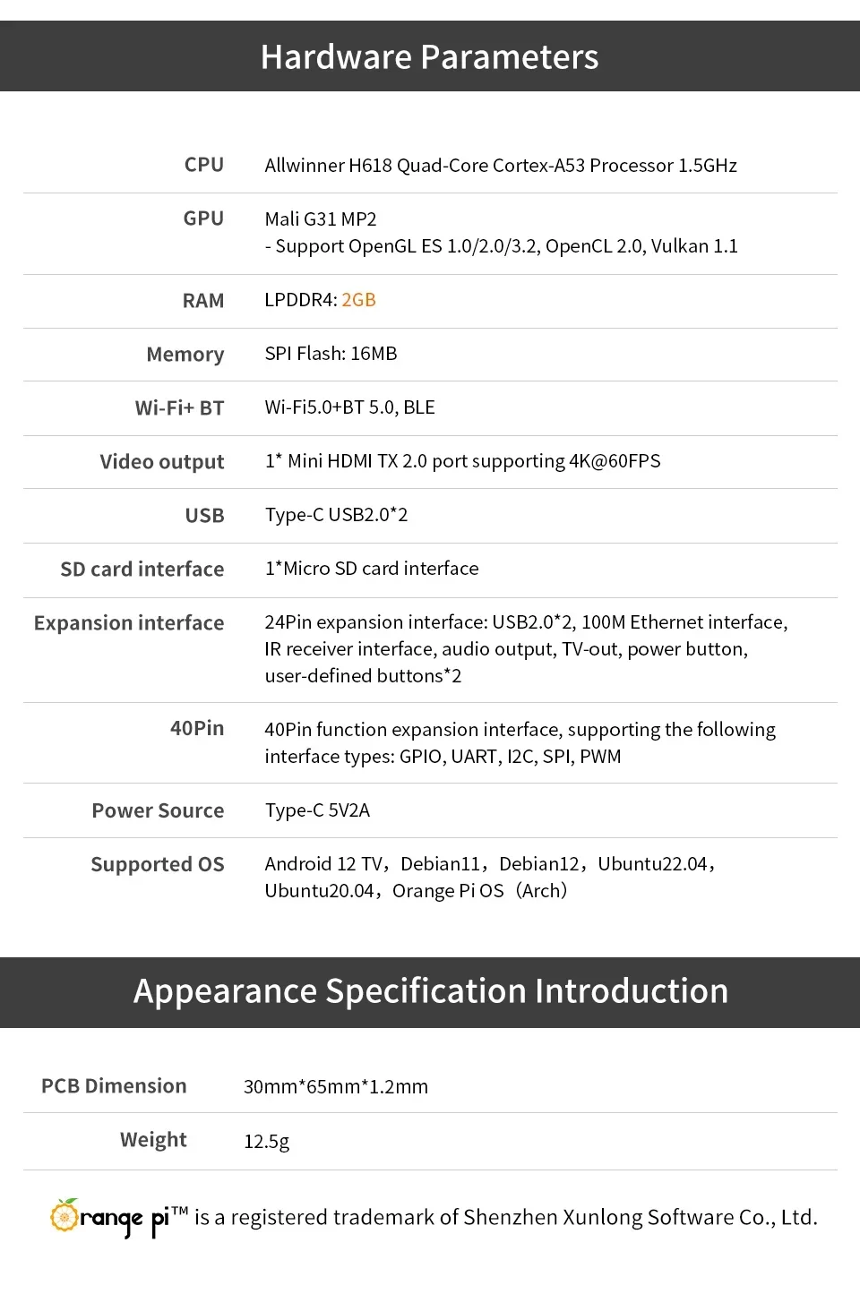 <span class="SnowProductCharacteristics_SnowProductCharacteristicsItem__titleContent__534v9">Orange Pi Zero 2W PCB Size</span> 30*65*1.2mm