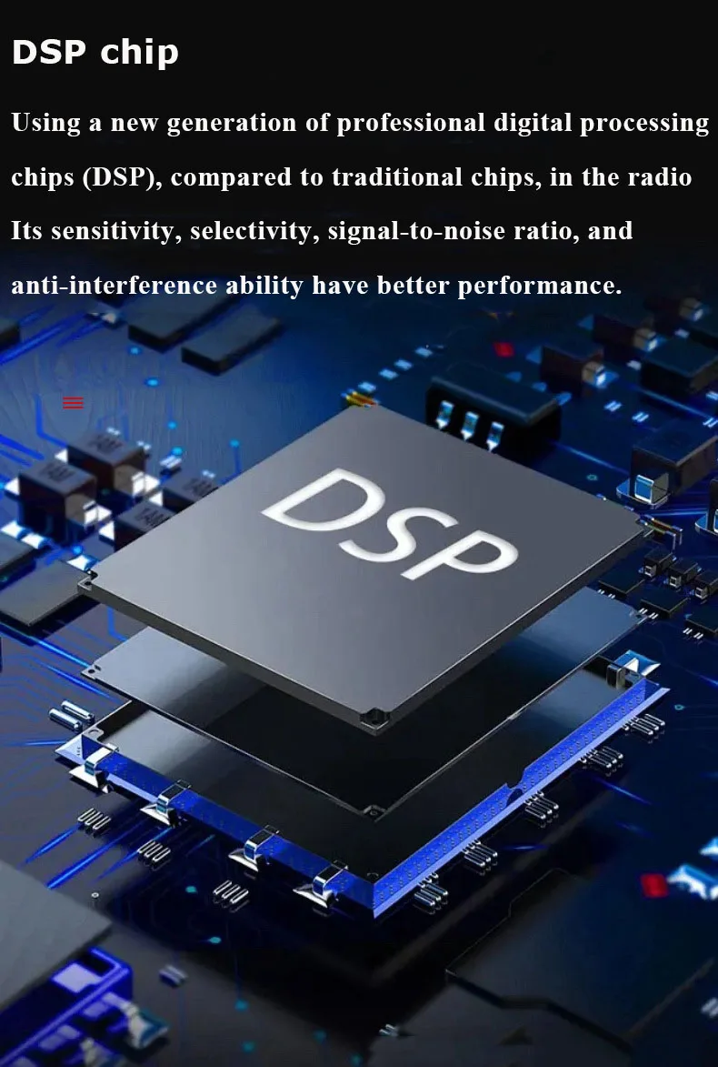 Оснащенный новым поколением профессиональных микросхем цифровой обработки (DSP) по сравнению с традиционными микросхемами, он имеет лучшую чувствительность, селективность, отношение сигнал/шум, и способность защиты от помех при радиоприеме.