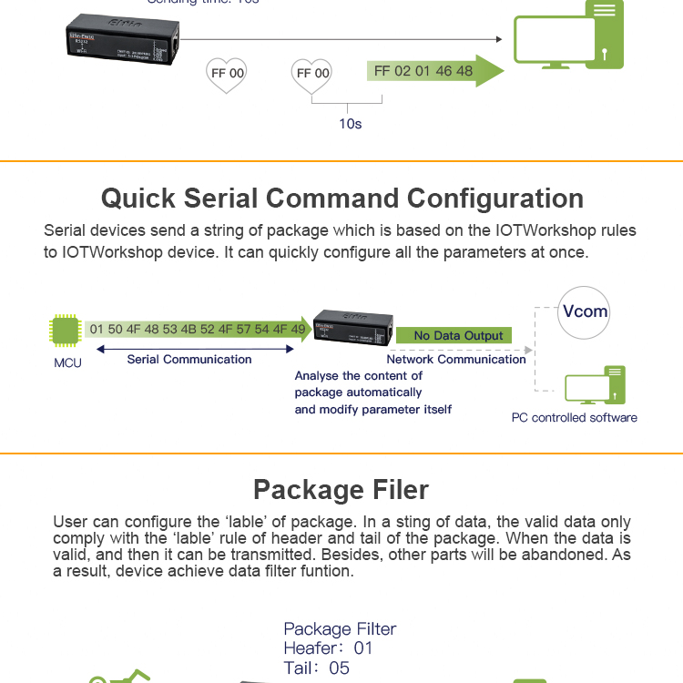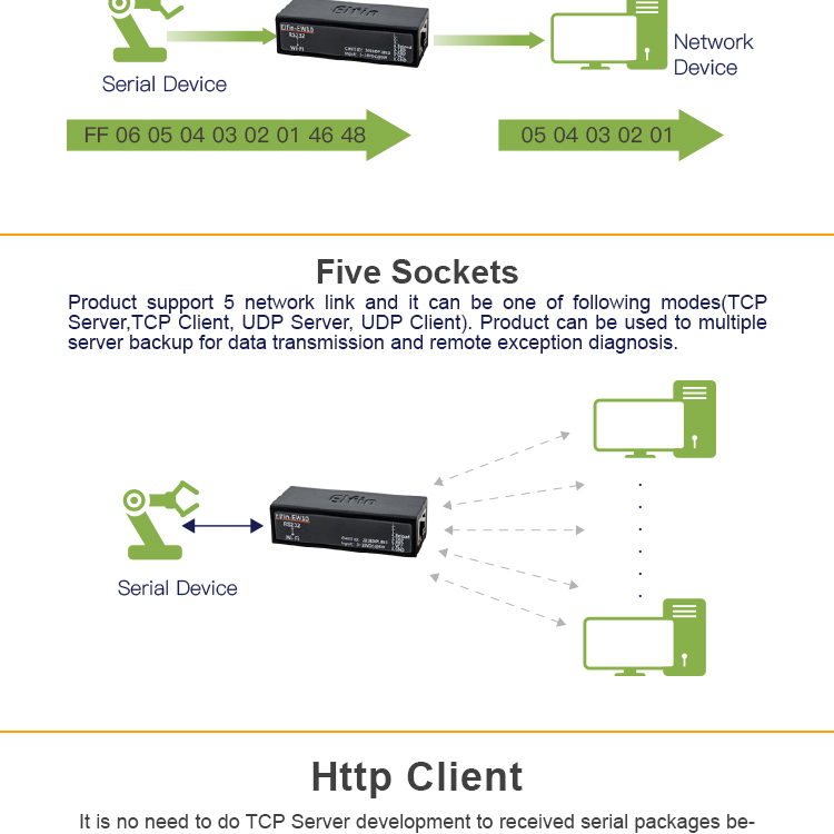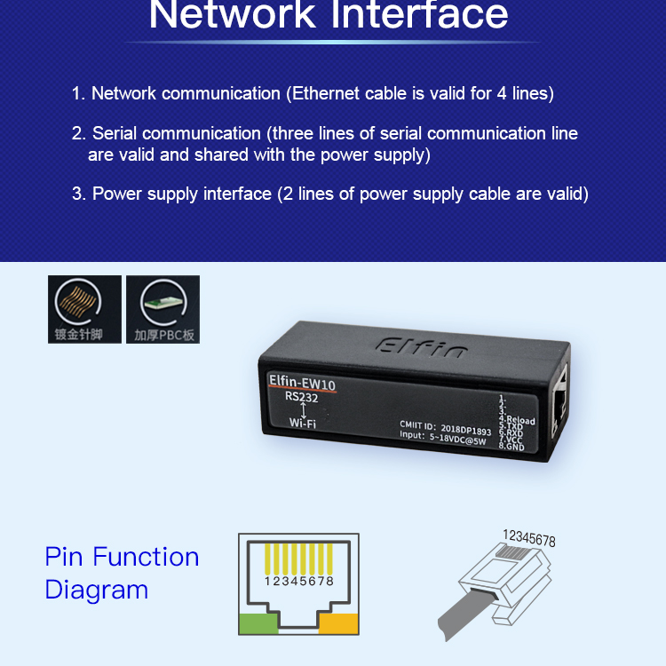Блок Elfin-EW1X является полным решением для последовательного порта устройства, подключаемого к сети. Это мощное устройство поддерживает надежную и проверенную операционную систему, хранящуюся во флэш-памяти, встроенный веб-сервер, полный стек протоколов TCP/IP и шифрование на основе стандартов (AES).