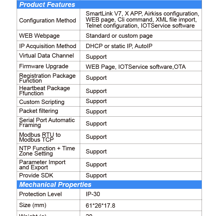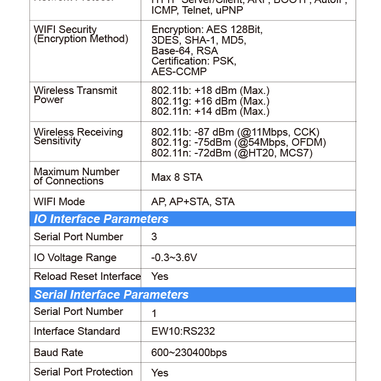 • Поддержка RS232 для преобразования Ethernet/Wi-Fi, последовательная скорость до 460800 bps