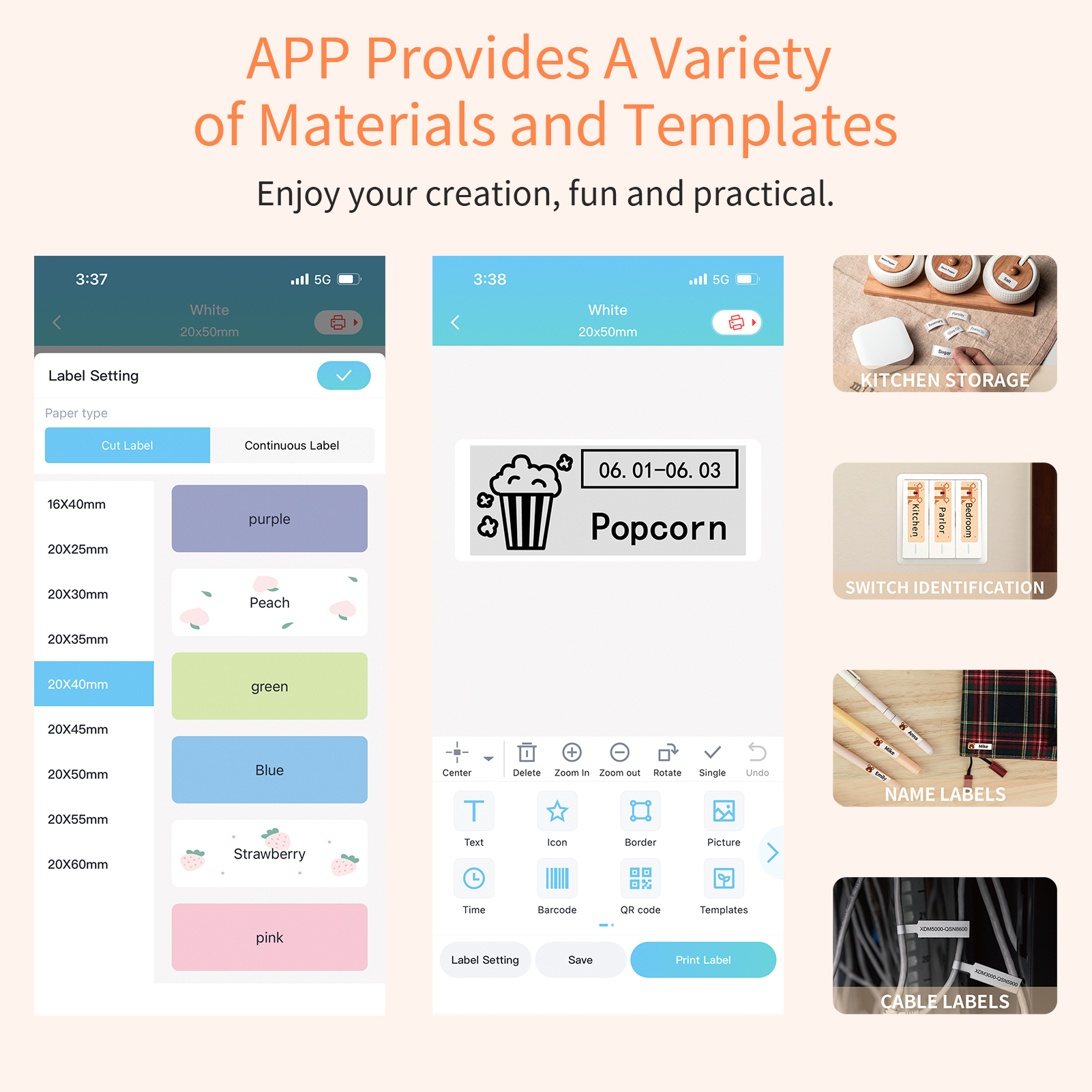 Многофункциональный принтер этикеток-мини и портативный принтер этикеток, способный печатать различные наклейки, такие как бирка принца, текст, значок, рамка, изображение, время, 1D код, QR-код, линия и т. Д. Широко используется в домашнем хранилище, примечании к макияжу, создании журналов, офисе, учебе.