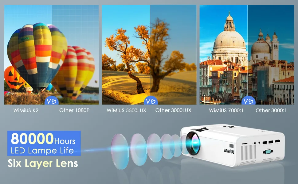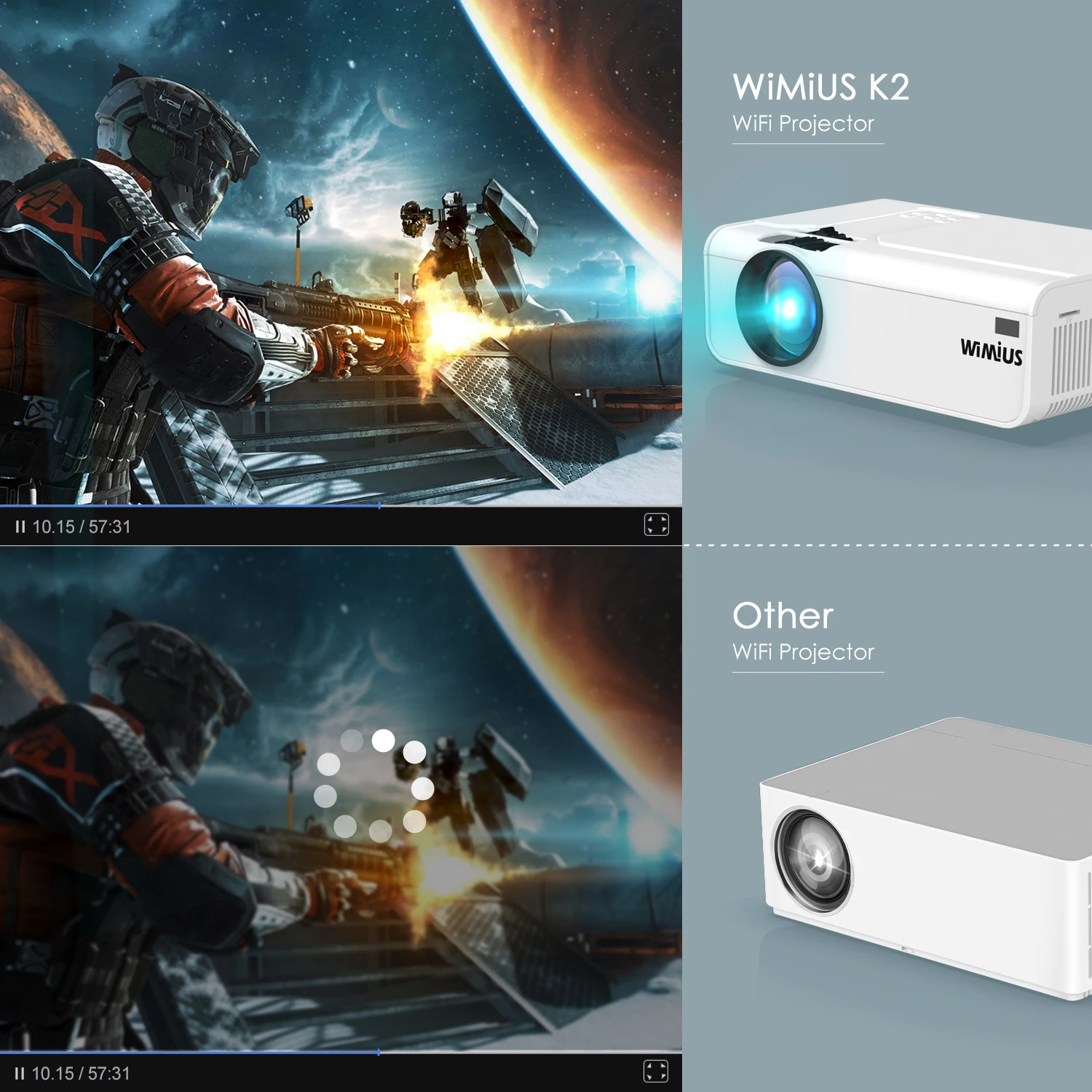 Собственное разрешение 1280x800 с поддержкой Full HD 1080P идеально подходит для просмотра фильмов и видеоигр. Эксперт по мини-проекторам WiMiUS K2 в съемке деталей в собственном разрешении 720P, это в 2 раза больше деталей, чем у других проекторов с поддержкой 1080P. Он Улучшает контрастность изображения, открывает ощущение света и темноты и улучшает экспрессию сцены.