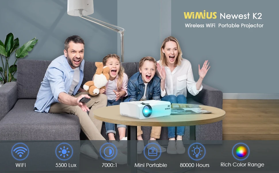 【Мини-проектор】 Портативный мини-проектор K2 со встроенной функцией Wi-Fi, он может подключаться к смартфону и iPad без проводов. Дополнительный адаптер HDMI не требуется. Этот светодиодный видеопроектор может легко отображать фильмы, видео, приложения, игры и фотографии на мобильных устройствах на большом экране в любое время. Это наш высокопроизводительный Wi-Fi-проектор.