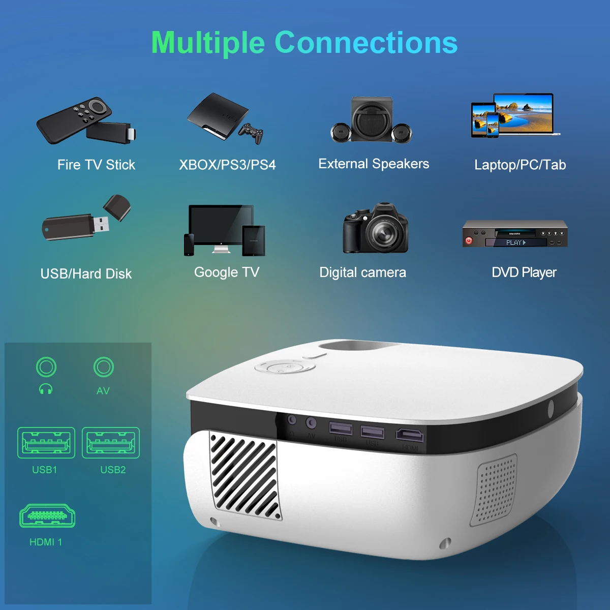 The S25 projector has HDMI / USBx2 / VGA / AV(YPbPr) / 3.5mm Earphone Jack. Compatible with Fire TV Stick, DVD Player, Xbox, Laptop, Wii, USB disk, Computer, Headsets, 2.0 External Speaker, iPhone Android smartphones, iPad Tablets, PS3 PS4 game playing console, etc.