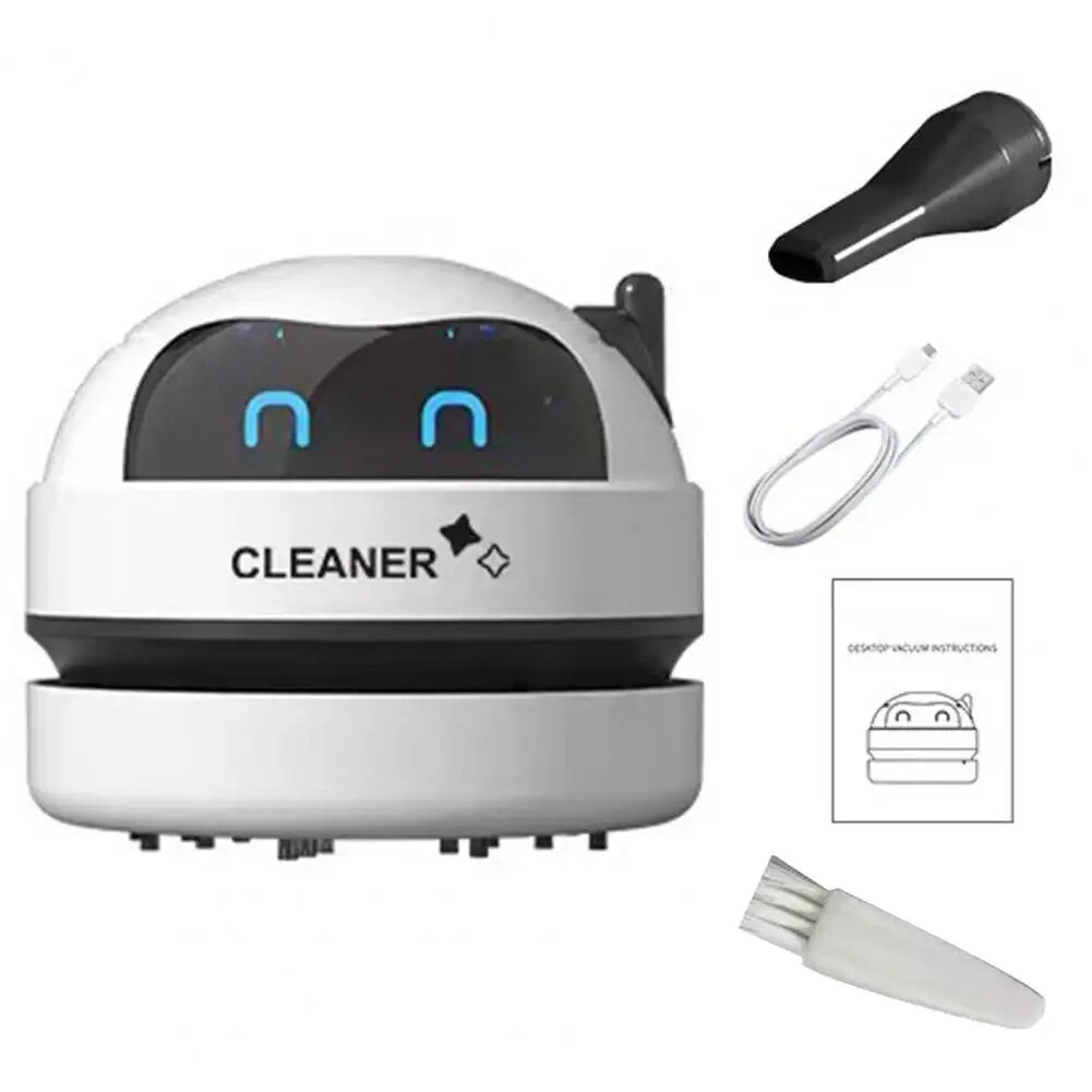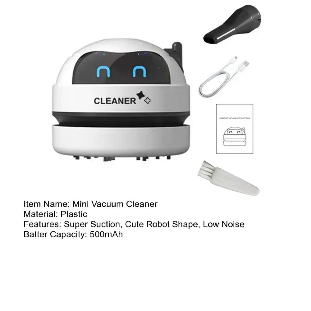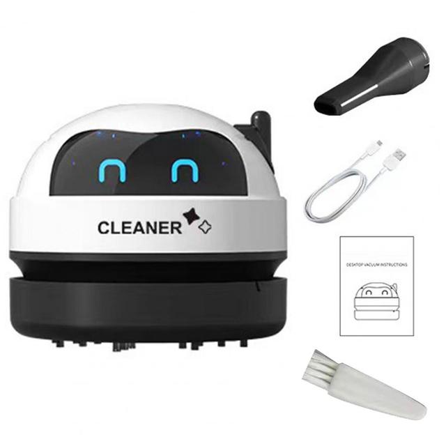 Этот мини-пылесос с мощным всасыванием и плотной щетиной эффективно очищает ваш стол от крошек из резины, бумаги, закусок и дыма. Симпатичная мультяшная форма робота также может украсить ваш рабочий стол.