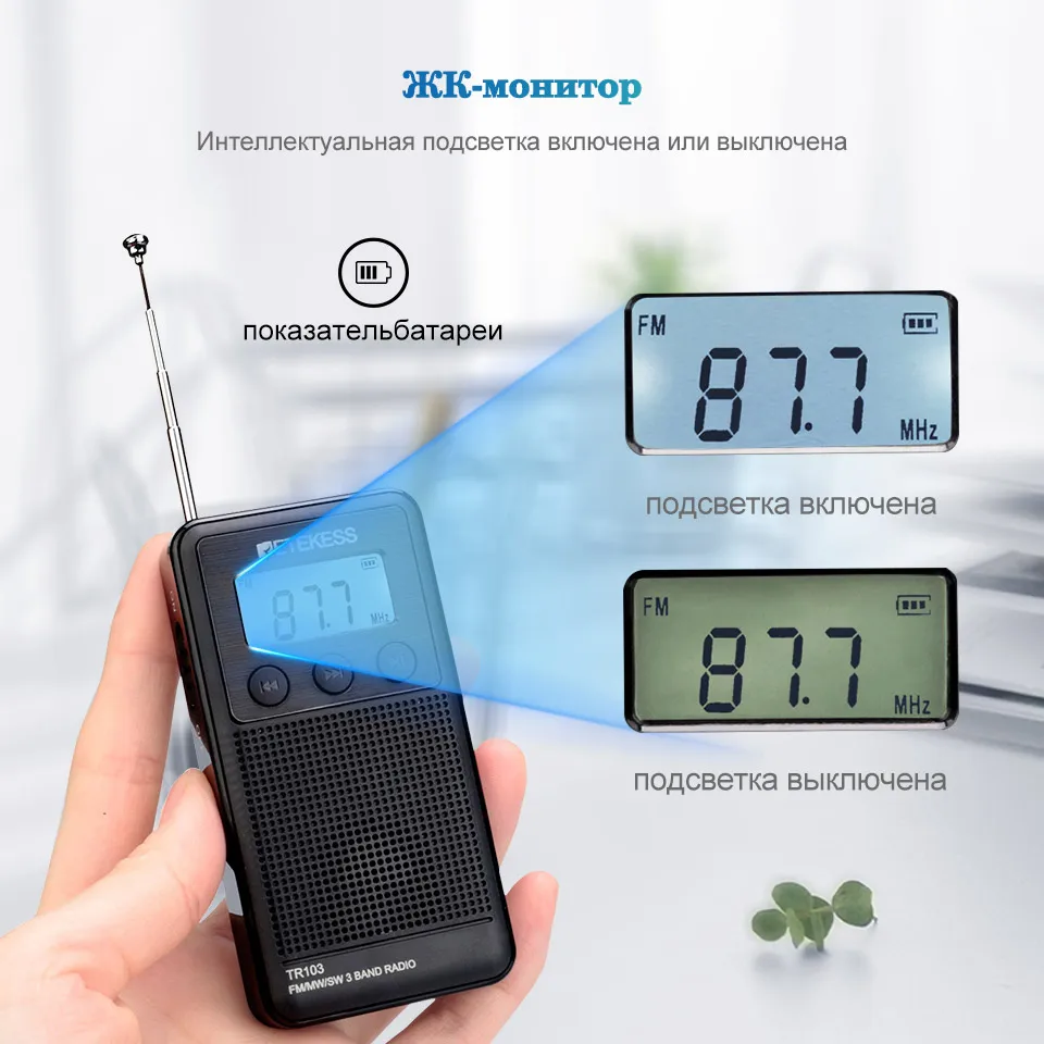 1. Карманный FM /  MW / SWЦифровой Тюнинг Радиоприёмник:FM 64/87-108 МГц; AM 520/522-1710 кГц; SW 3,2-22 МГц; Транзисторное радио автоматически сканирует и сохраняет доступные станции, после чего вы можете начать просматривать программы, наслаждаясь любимыми новостями или песнями.