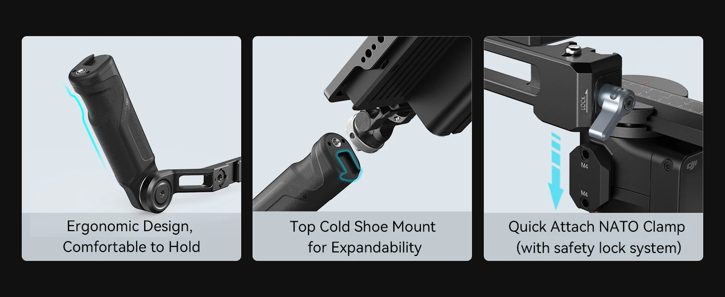Рукоятка-строп SmallRig для DJI RS 3 / RS 3 Mini 4197Предназначен для снижения утомляемости рук во время съемки под низким углом и предлагает множество вариантов крепления аксессуаров. Установка его на RS 3 Mini не сместит центр тяжести. Компактная рукоятка весит всего 198 г, но может выдерживать до 6 кг. Он быстро блокирует стабилизатор с помощью зажима NATO, который имеет кнопку защиты от падения для обеспечения безопасности. Встроенная резьба 1/4 ”-20 и два крепления для холодного башмака сверху и сбоку поддерживают крепление монитора 2905B, звуковой приемник, систему передачи изображения. Снаряжение также можно наклонять на 180 ° с помощью храпового механизма для удобного хранения. В целом, нежная и Компактная рукоятка отлично сочетается с подвесом.
