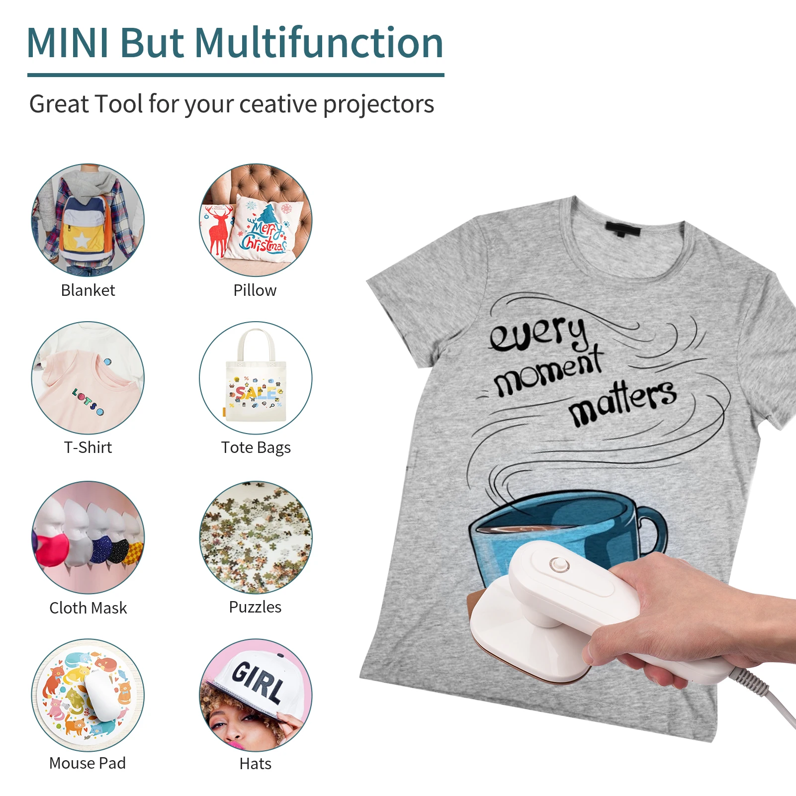 Мини-машина для передачи тепла-это не просто печатная машина для футболок, этот термопресс идеально подходит для печати рубашек, одежды, шляп, сумок, подушек для мыши, сумок, наволочек, одежда, как детские Боди и многое другое! Температура может достигать 150 ℃.