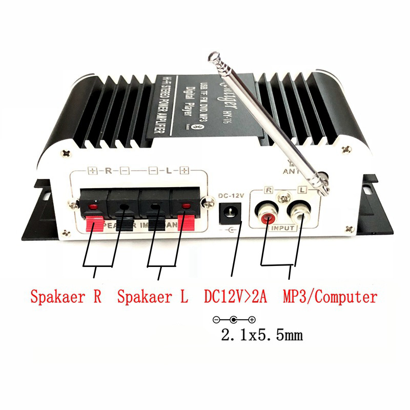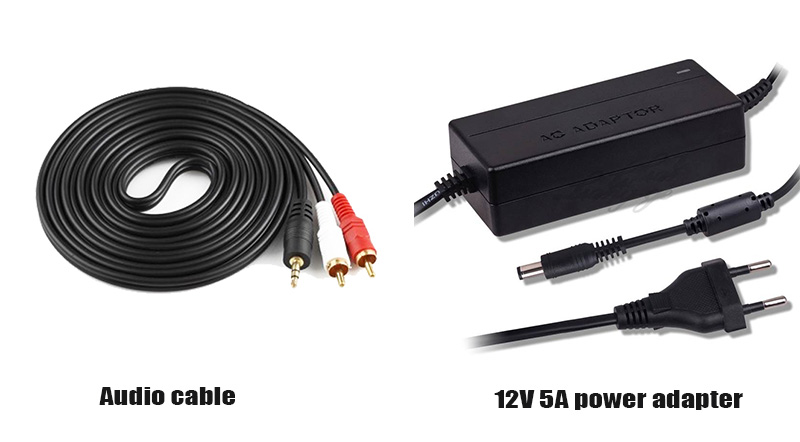 2. с питанием 12 В 5 А: В комплект входит 1 усилитель + 1 пульт дистанционного управления + 1 Питание 12 В 5 А (вилка для США или ЕС) + аудиокабель