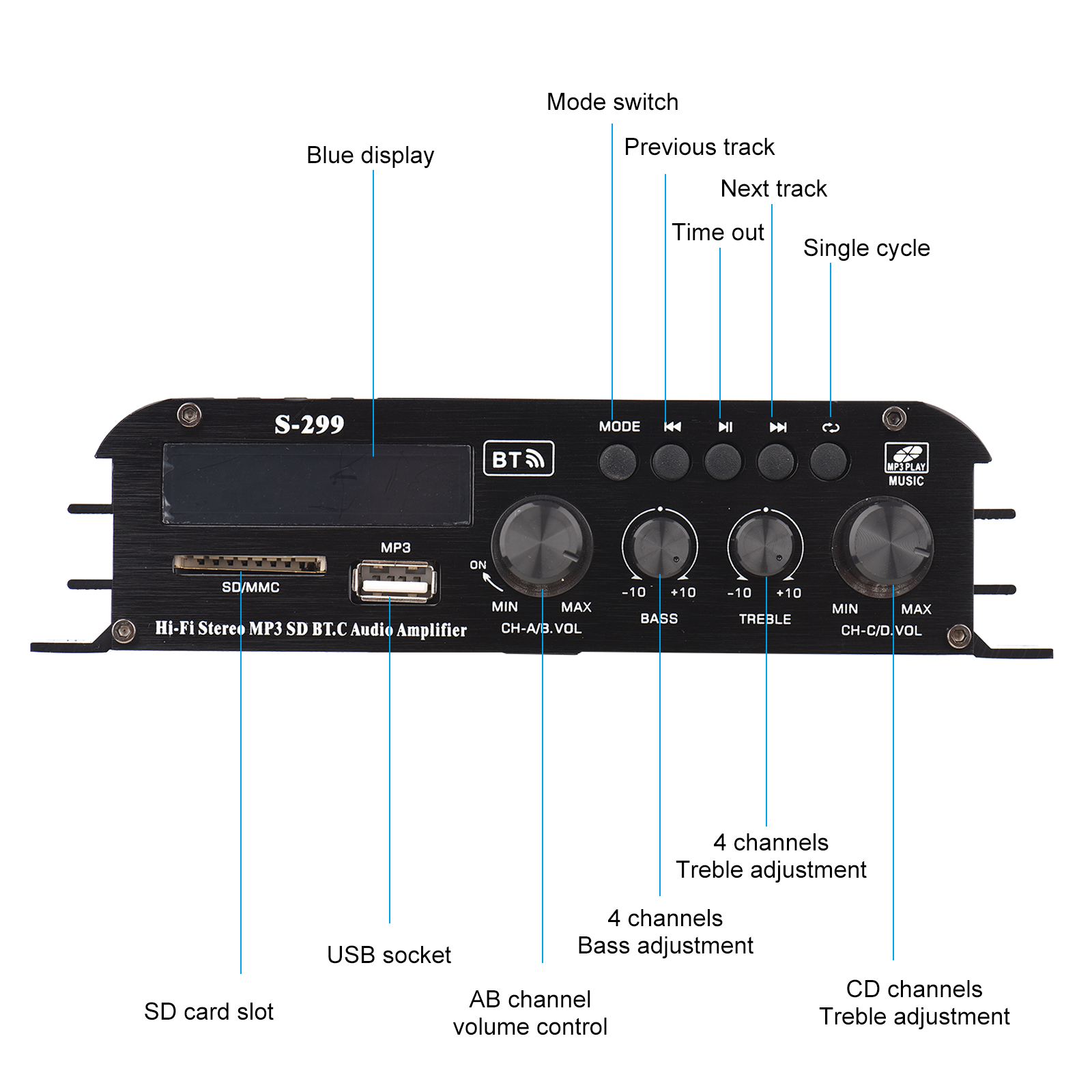 С BT, USB, чтением карт памяти и функцией дистанционного управления.