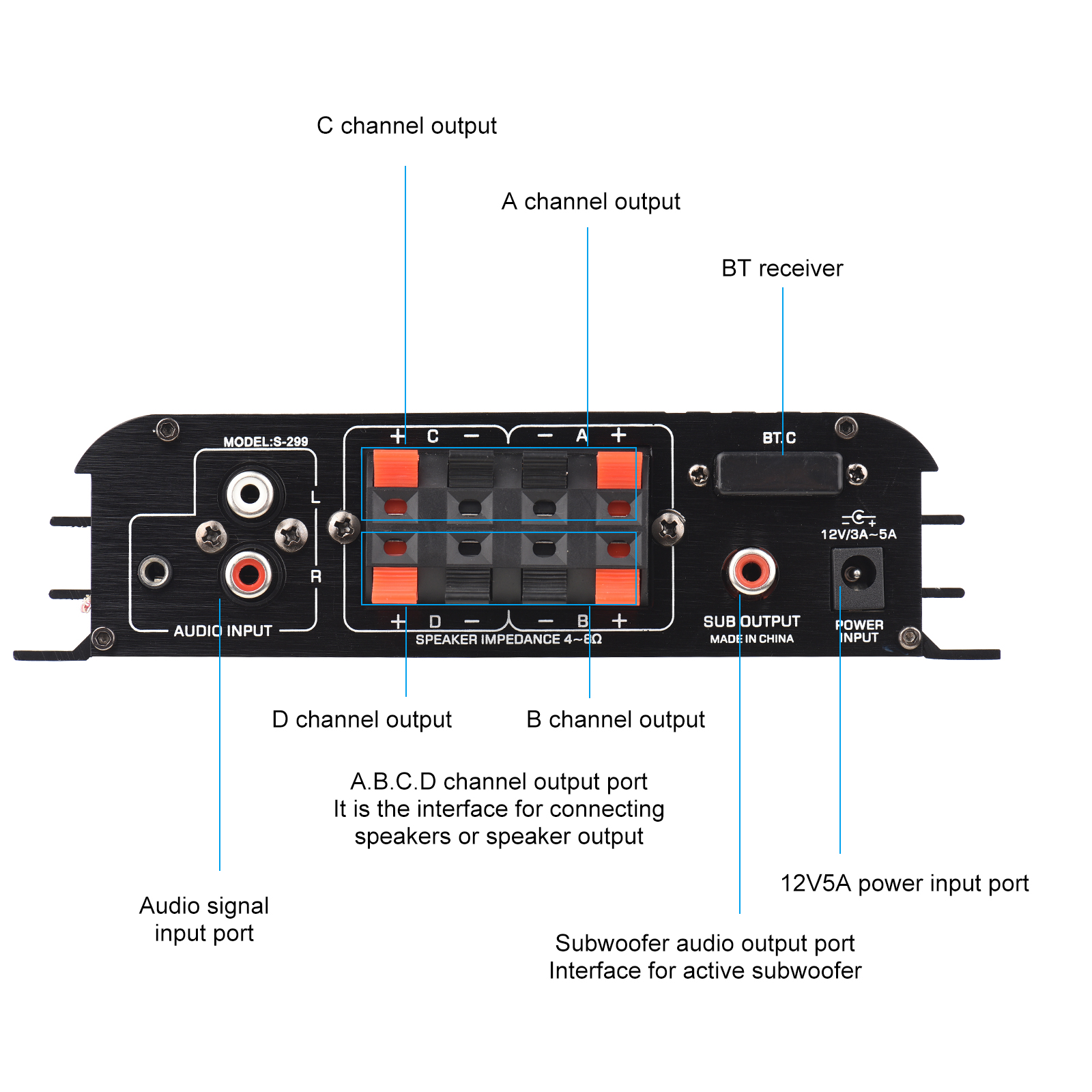 Помимо подключения к четырем динамикам мощностью 40 Вт, его также можно подключить к активному сабвуферу, который не имеет ограничения мощности.