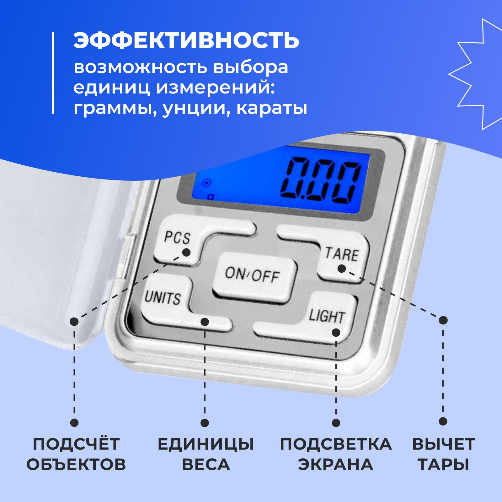 2. Возможность выбора единиц измерений: граммы, унции, караты. Вам не придется самостоятельно конвертировать показания;