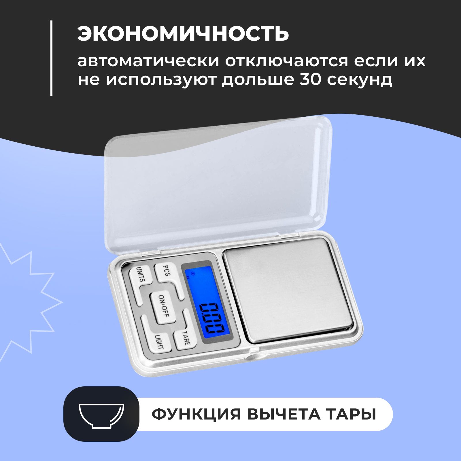 5. Экономичность: весы автоматически отключаются если их не используют дольше 30 секунд;