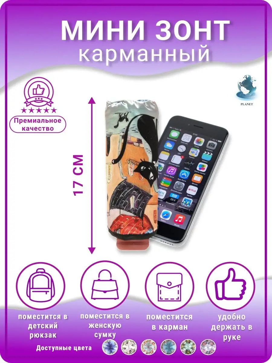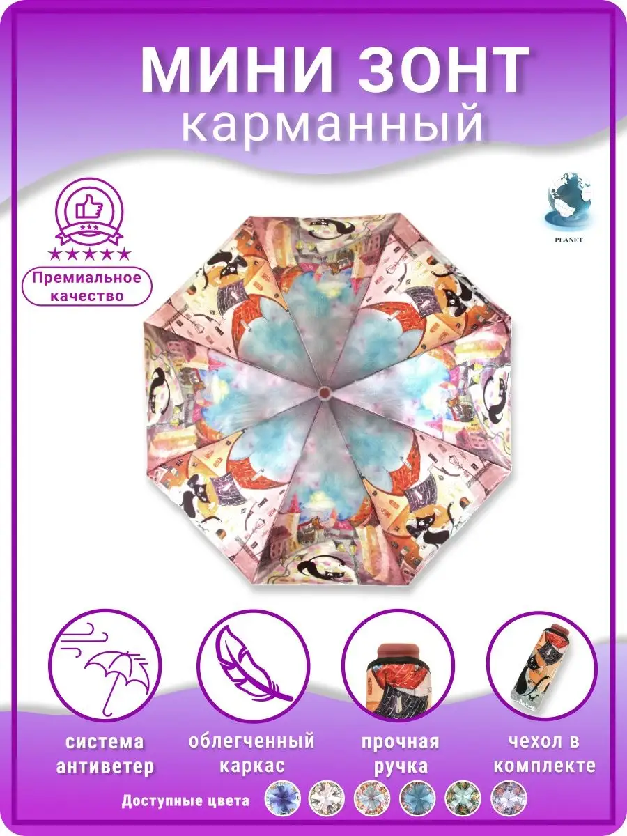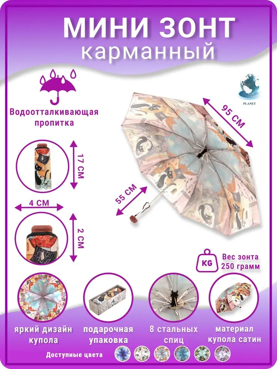 Описание: Зонт мини механический Planet Umbrella стильный классический вытяжной женский детский зонт с оригинальным дизайнерским решением: Отлично подойдет зонтик женщинам, девушкам, девочкам любого возраста. Зонт миниатюрный очень компактный, его можно с легкостью поместить в детском рюкзаке, сумке, дамской сумочке, кармане, зонт хорошо лежит в руке. Ручка зонта изготовлена из качественного материала ABS-пластика, который сохранит внешний вид и прослужит долгое время. Прочный стальной каркас с антикоррозийным покрытием, материал купола - мягкий сатин с водоотталкивающей пропиткой. Диаметр купола 95 см, количество спиц 8 длина в сложенном виде 17 см, высота от ручки до купола 55 см, вес 250 грамм. Очень легкий зонт маленького размера отлично подойдет для школьника, девушки-студента, женщине любого возраста. Благодаря минимальному размеру ребенок может носить его с собой в школу в рюкзаке. В комплект входит аксессуар чехол для зонта, что позволит хранить зонт в удобном месте. Усиленный женский складной зонт, компактный, отлично держит всю конструкцию в любую непогоду, справляясь даже с сильными порывами ветра и шторма, благодаря защите системы антиветер/антишторм. Зонтик аксессуар складной подойдет на любое время года, защитит Вас в любую непогоду в зиму, весну, лето и осень. Благодаря усиленному каркасу из 8 спиц защитит Вас от дождя, снега, солнца в походе на пляж, прогулке на улице в парке и на даче в саду. Зонт лучший подарок любимой женщине, девушке, маме, подруге, бабушке, сестре для себя и близких. Zonti
