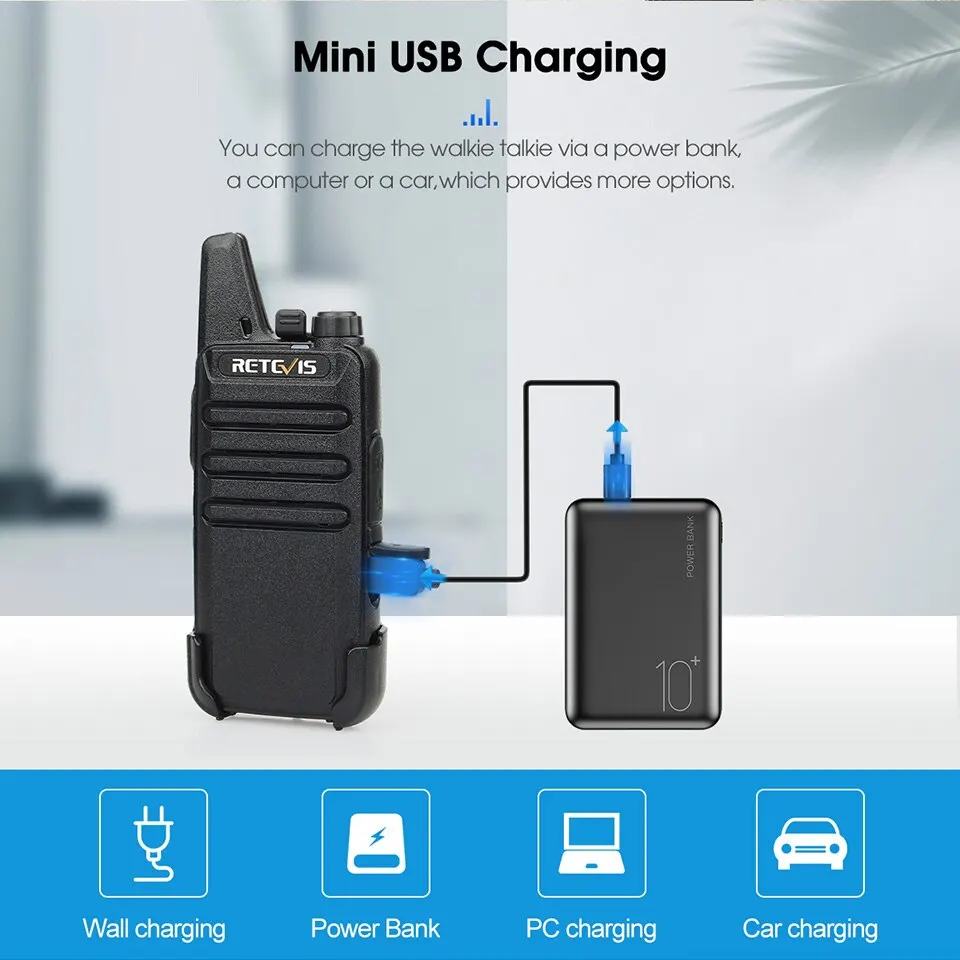 Благодаря порту для зарядки Mini USB эффективно заряжать рацию с помощью нескольких методов зарядки. Например, вы можете использовать внешний аккумулятор и компьютер для зарядки рации в любое время и в любом месте.