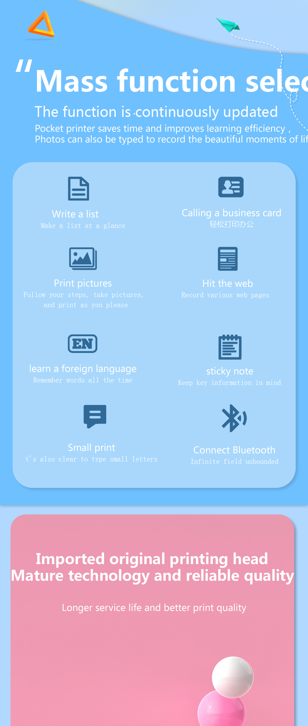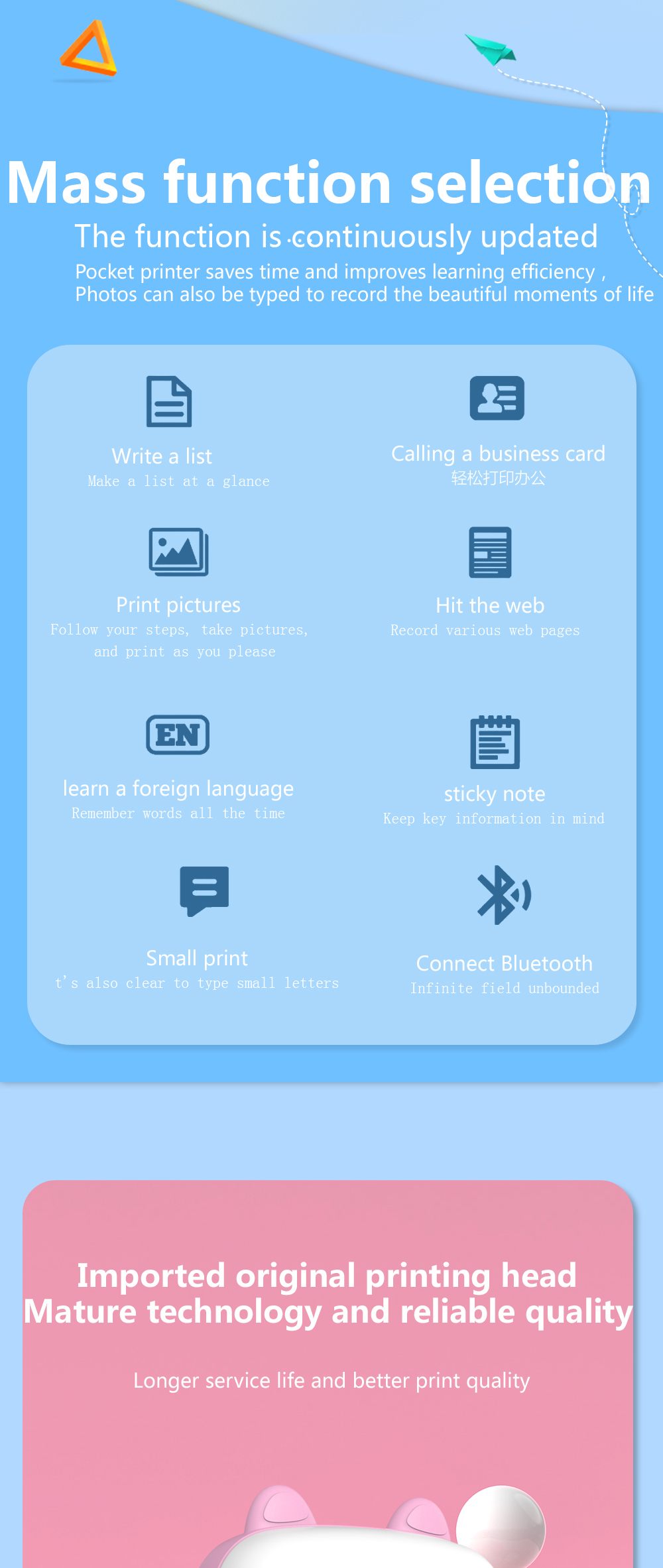1. Многофункциональность: фотопринтер может печатать фотографии, этикетки, сообщения, списки, записи, QR-код, голосовые заметки и поддерживать веб-печать.