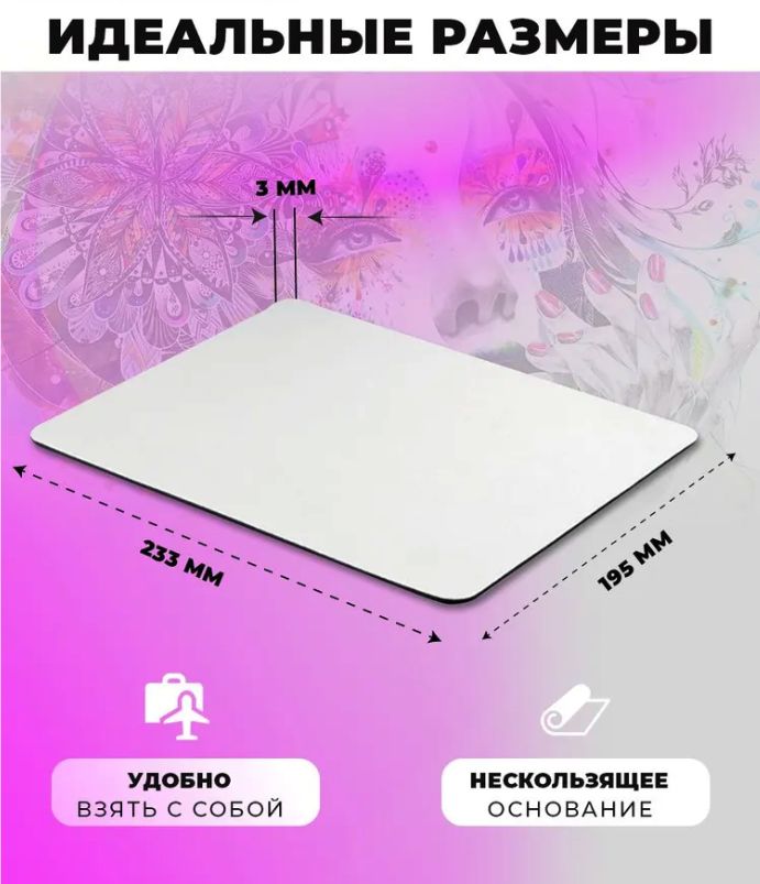 Это гарантирует, что аксессуар останется на месте даже при интенсивном использовании мыши.Индивидуальный дизайнИгровой коврик также имеет возможность нанесения сублимации - вы сможете создать уникальный дизайн и придать изделию индивидуальность.МобильныйКомпактные размеры позволят взять товар в поездку для работы вне дома - коврик отлично помещается в чехол или сумку для ПК и не займет много места.