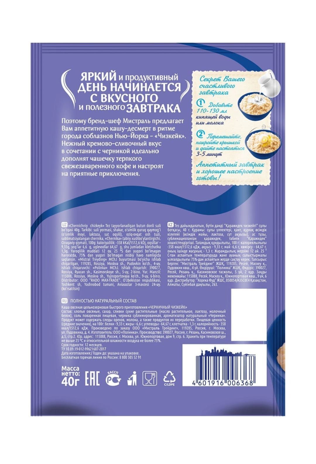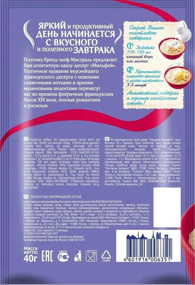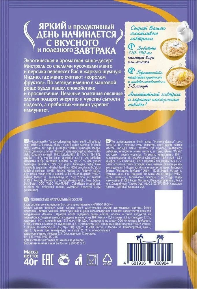 Описание: Каша овсяная Мистраль зарядит энергией, оставив чувство сытости надолго, а сочетание полезных плодов подарит отличное настроение на целый день. Попробуйте аппетитные каши-десерт.