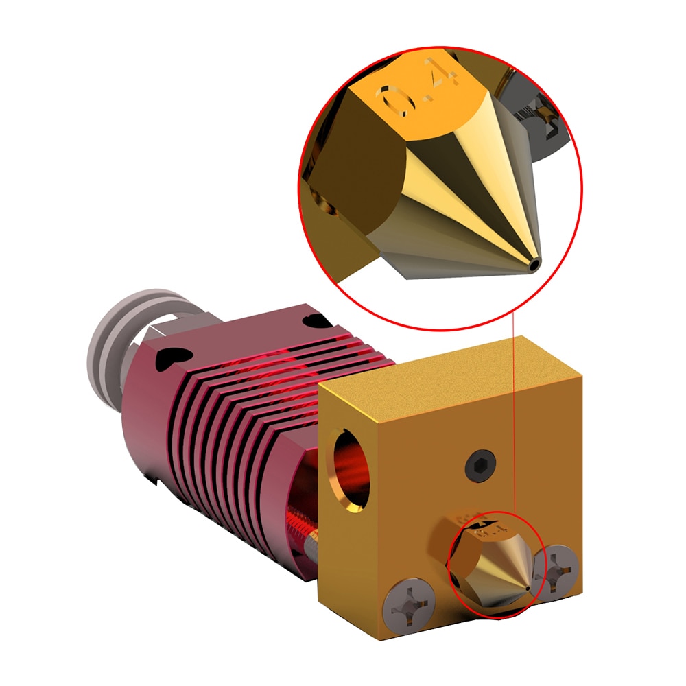2: Этот хотенд в сборе поставляется со всеми необходимыми частями нагревательного блока, теплового разрыва, радиатора и латунного сопла 0,4 мм.