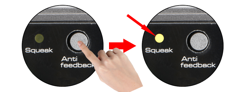 Нажмите кнопку «Защита от обратной связи», загорится индикатор «Squeak».