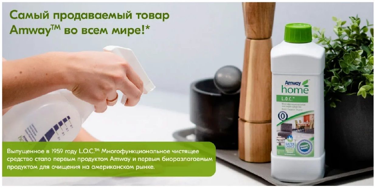 Выпущенное в 1959 году L.O.C. Многофункциональное чистящее средство, стало первым продуктом Amway и первым в мире биоразлагаемым чистящим средством. До сих пор это самый продаваемый товар Amway во всем мире!